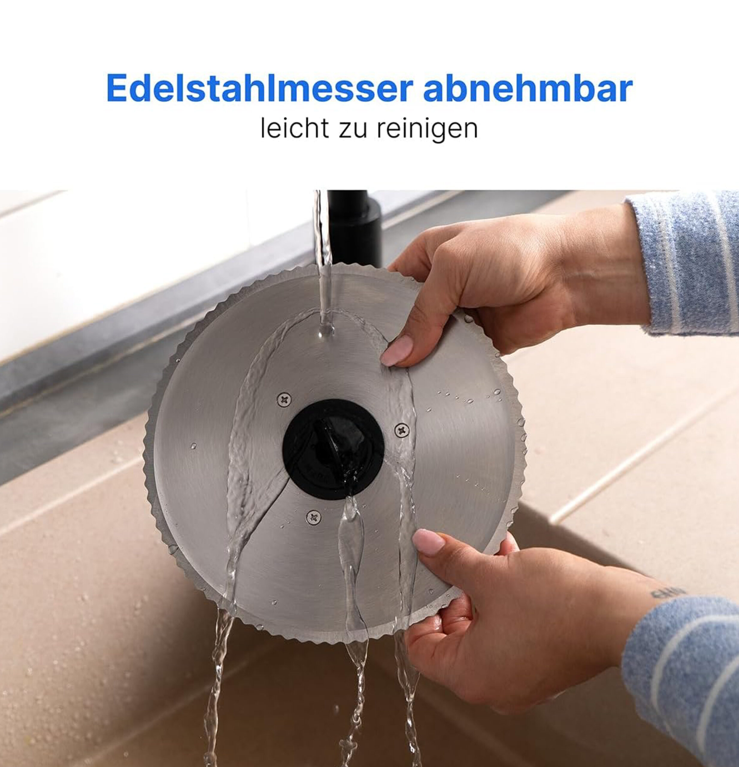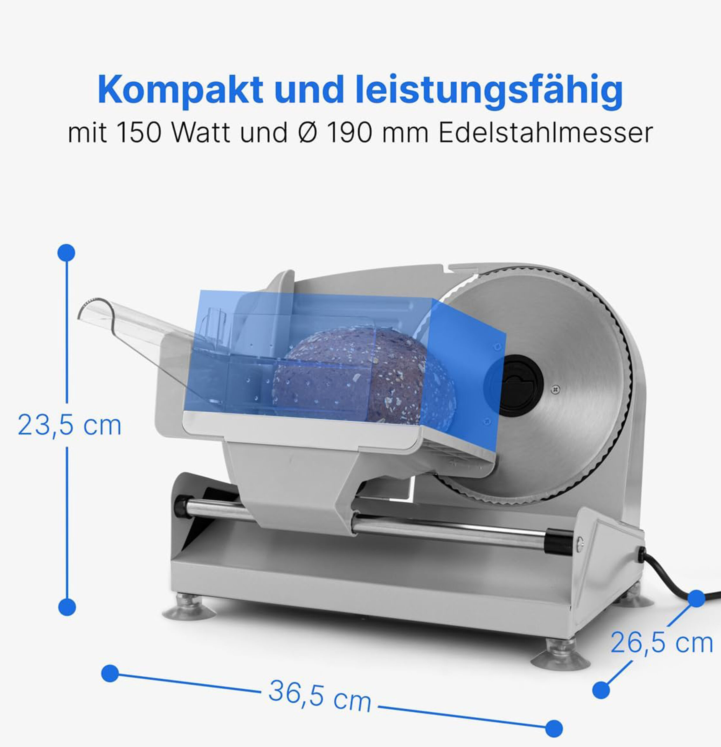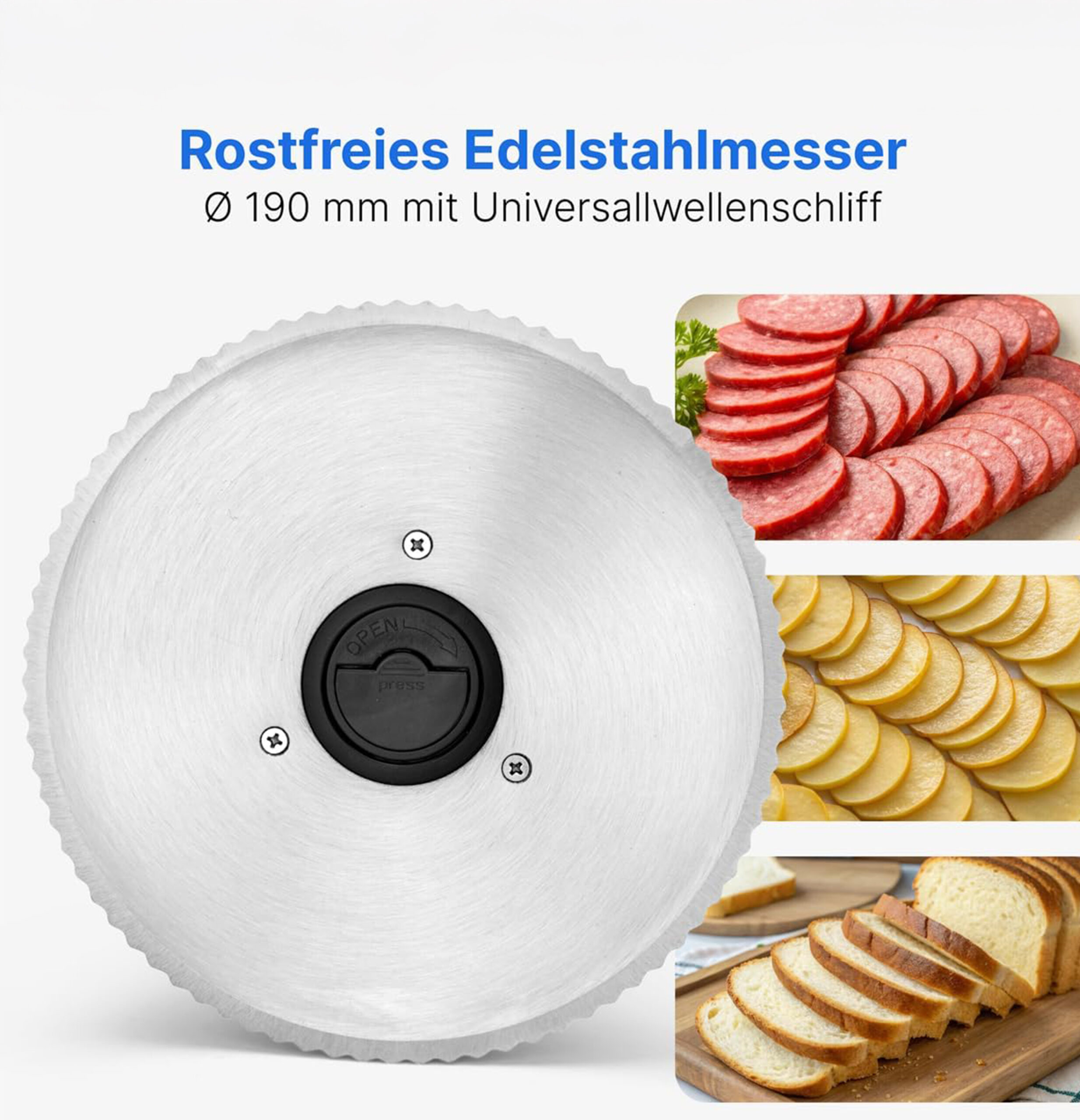| الميزات الخاصة | سمك قابل للتعديل، شفرة كبيرة بقطر 190 مم من الفولاذ المقاوم للصدأ، سكة معدنية إرشادية، حامل بقايا مع حماية للأصابع |