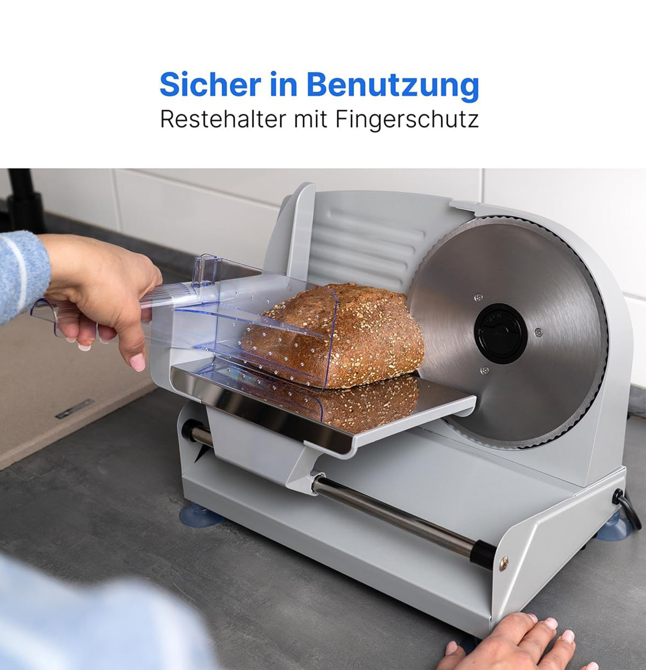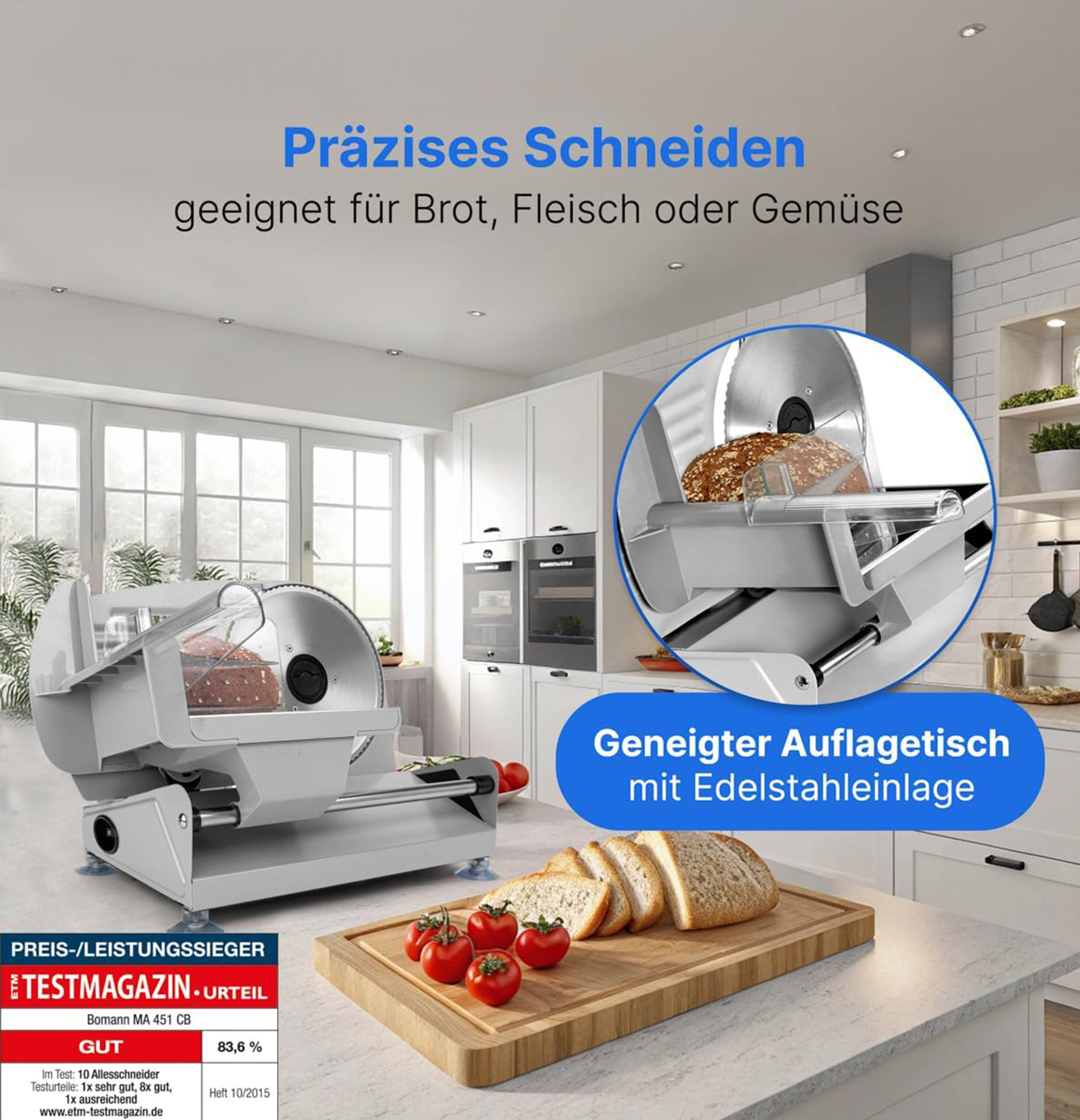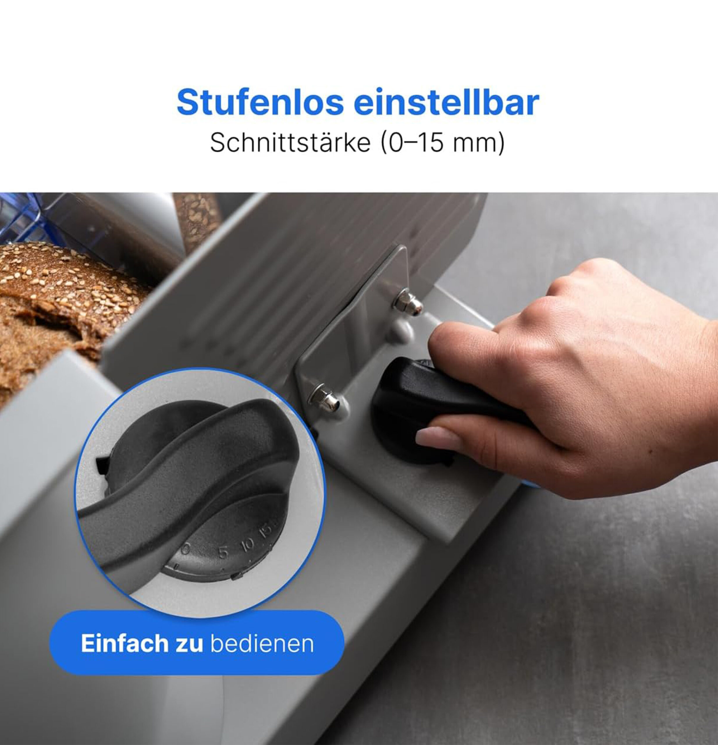 | الميزات الخاصة | سمك قابل للتعديل، شفرة كبيرة بقطر 190 مم من الفولاذ المقاوم للصدأ، سكة معدنية إرشادية، حامل بقايا مع حماية للأصابع |