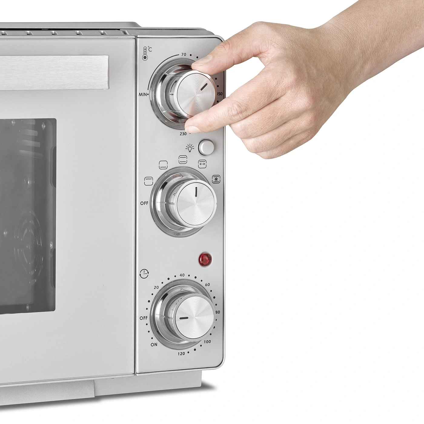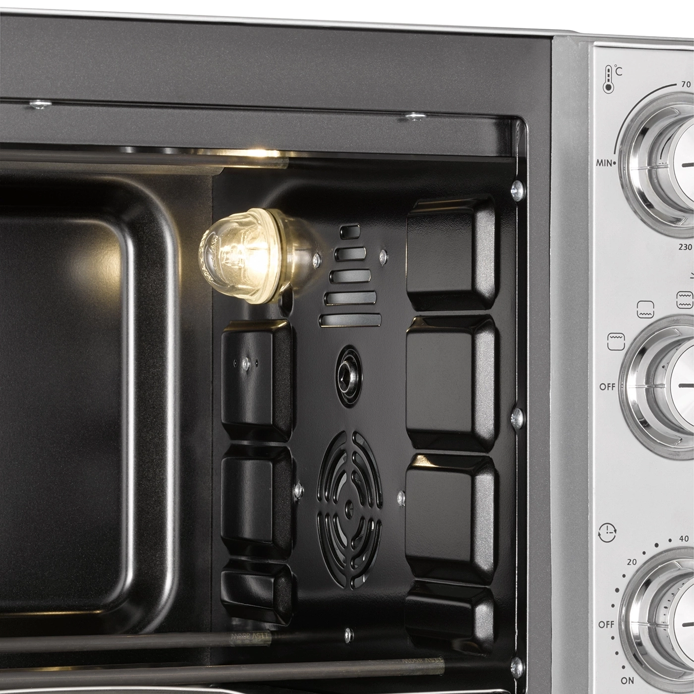 إيقاف تلقائي، هيكل معزول حراريًا، شواية دوارة بمحرك، إضاءة داخلية