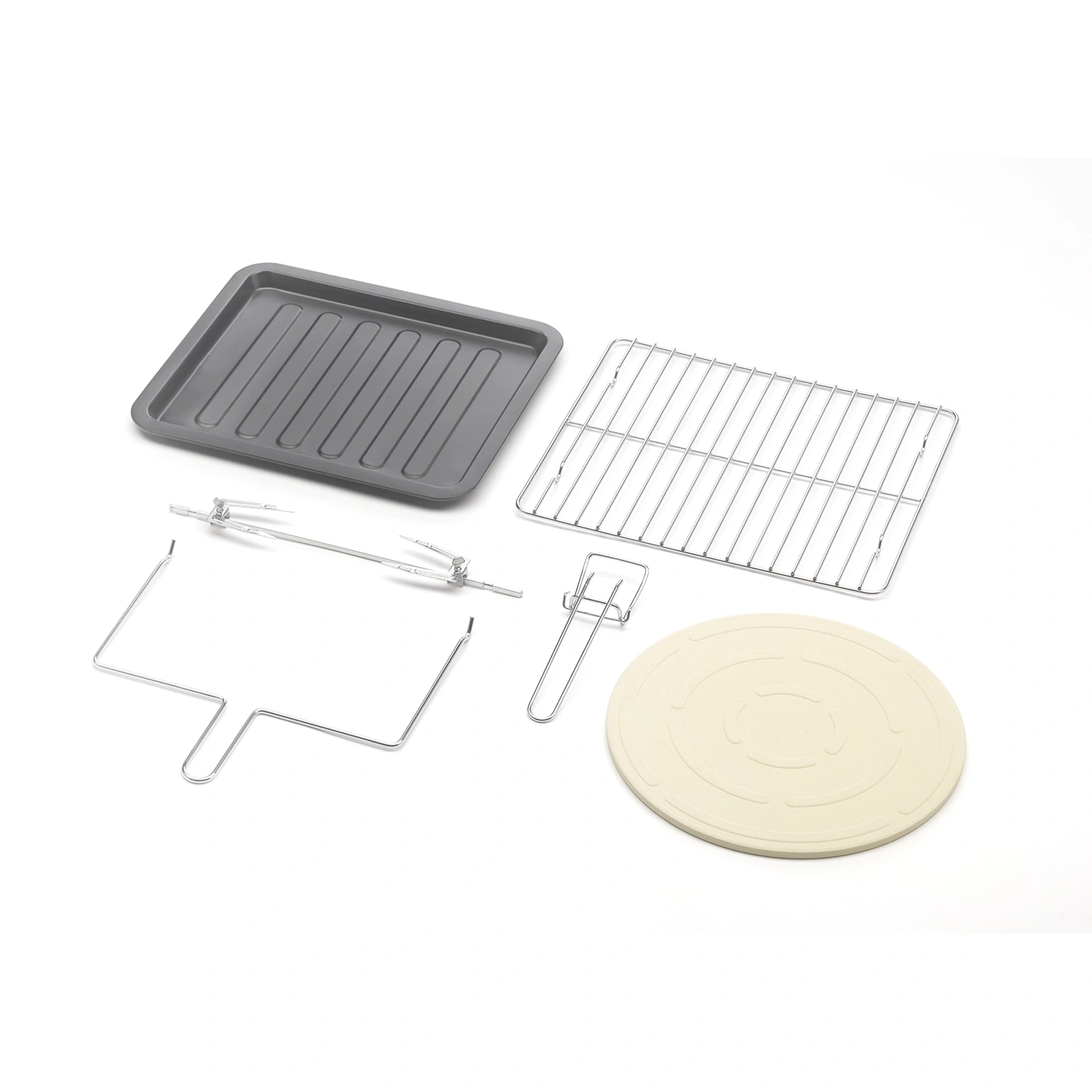 يشمل رف الشوي، الشواية الدوارة، صينية خبز غير لاصقة، وأدوات إزالة عملية للرف والشواية الدوارة