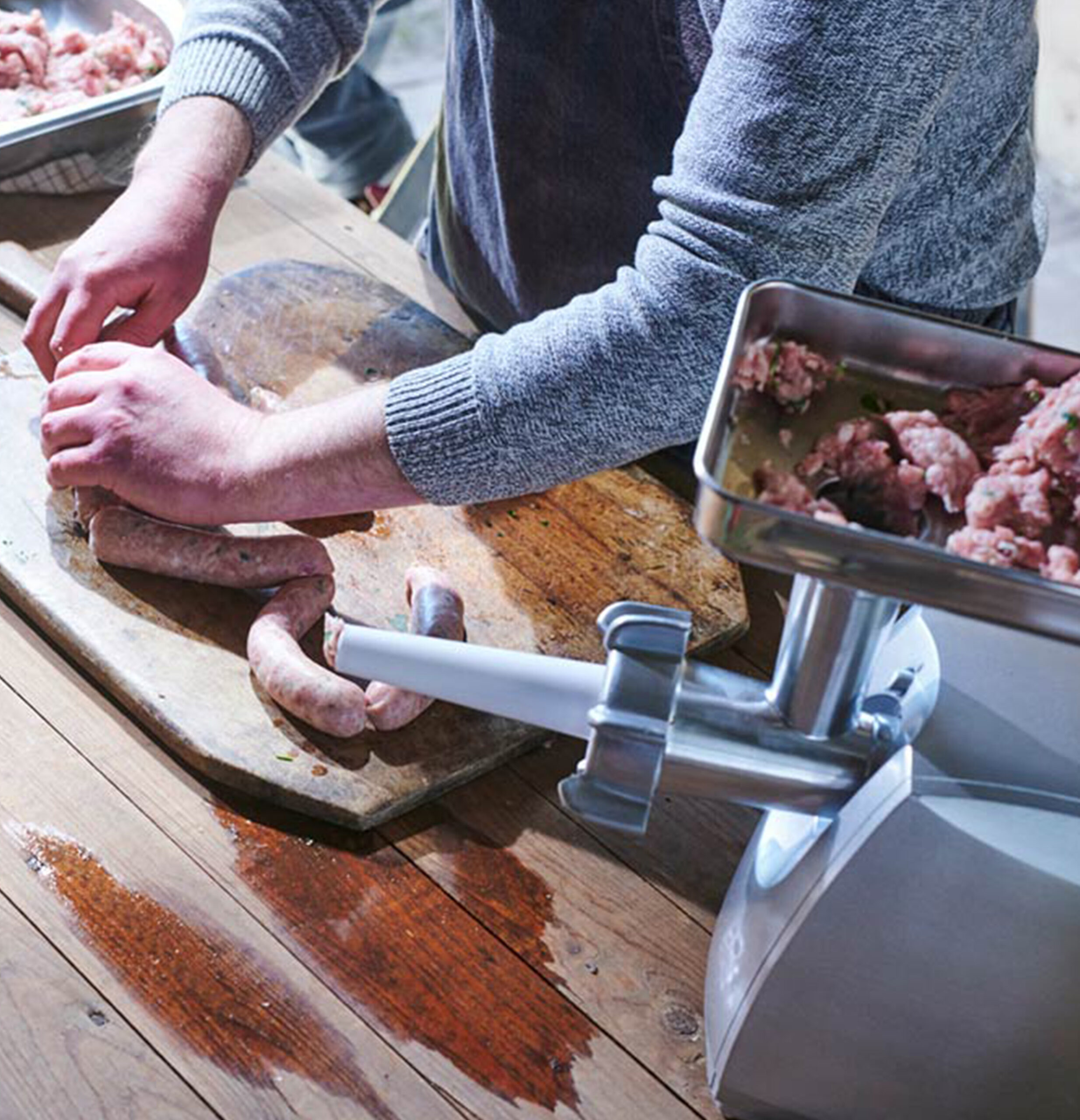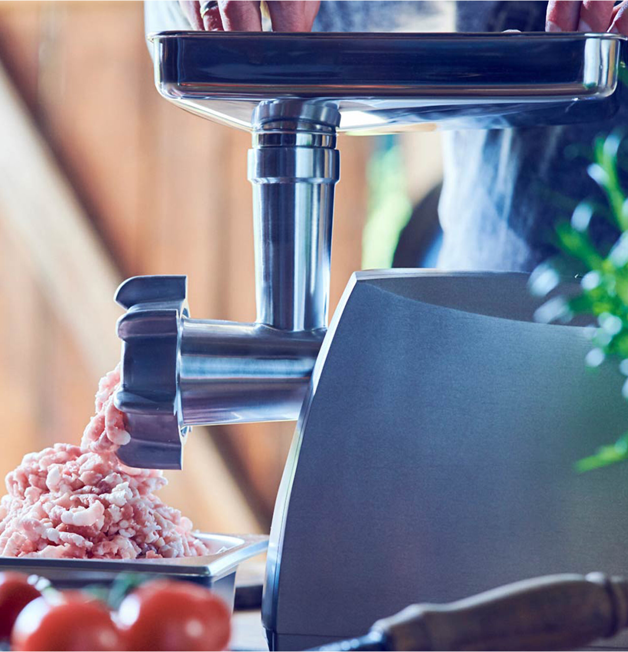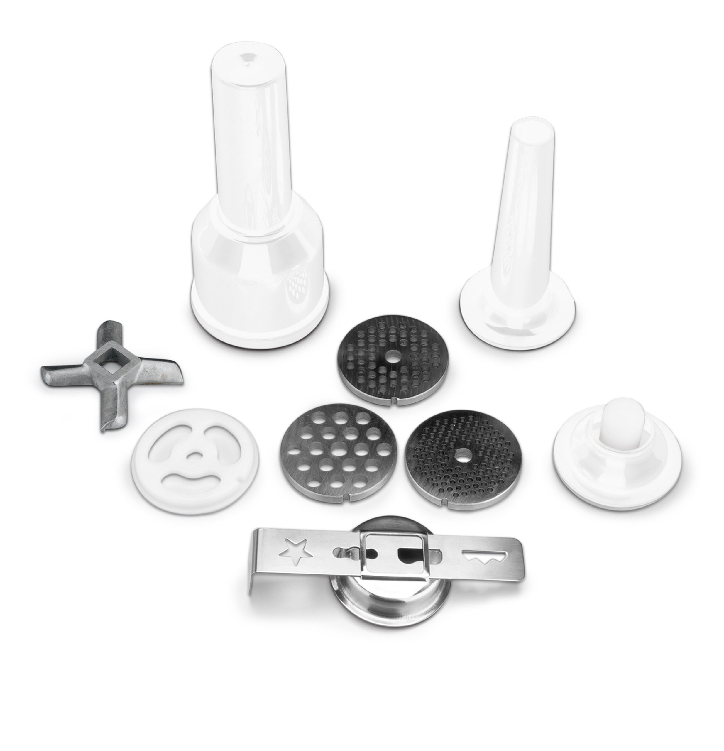 يتضمن 3 أقراص فرم (3 مم / 4.8 مم / 8 مم)، ملحق كِبّة للمطبخ الشرقي، ملحق حشو السجق وملحق صنع البسكويت