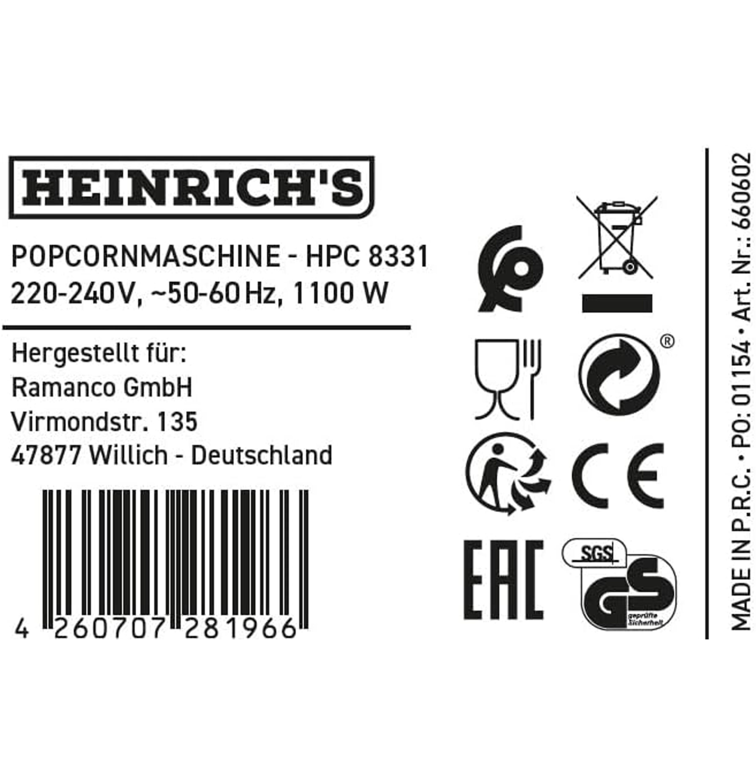 قوية الأداء: آلة الفشار من هاينريش تمنحك فشارًا طازجًا في غضون دقائق قليلة فقط بفضل قدرتها البالغة 1100 واط، لتستمتع بأجواء السينما داخل منزلك.