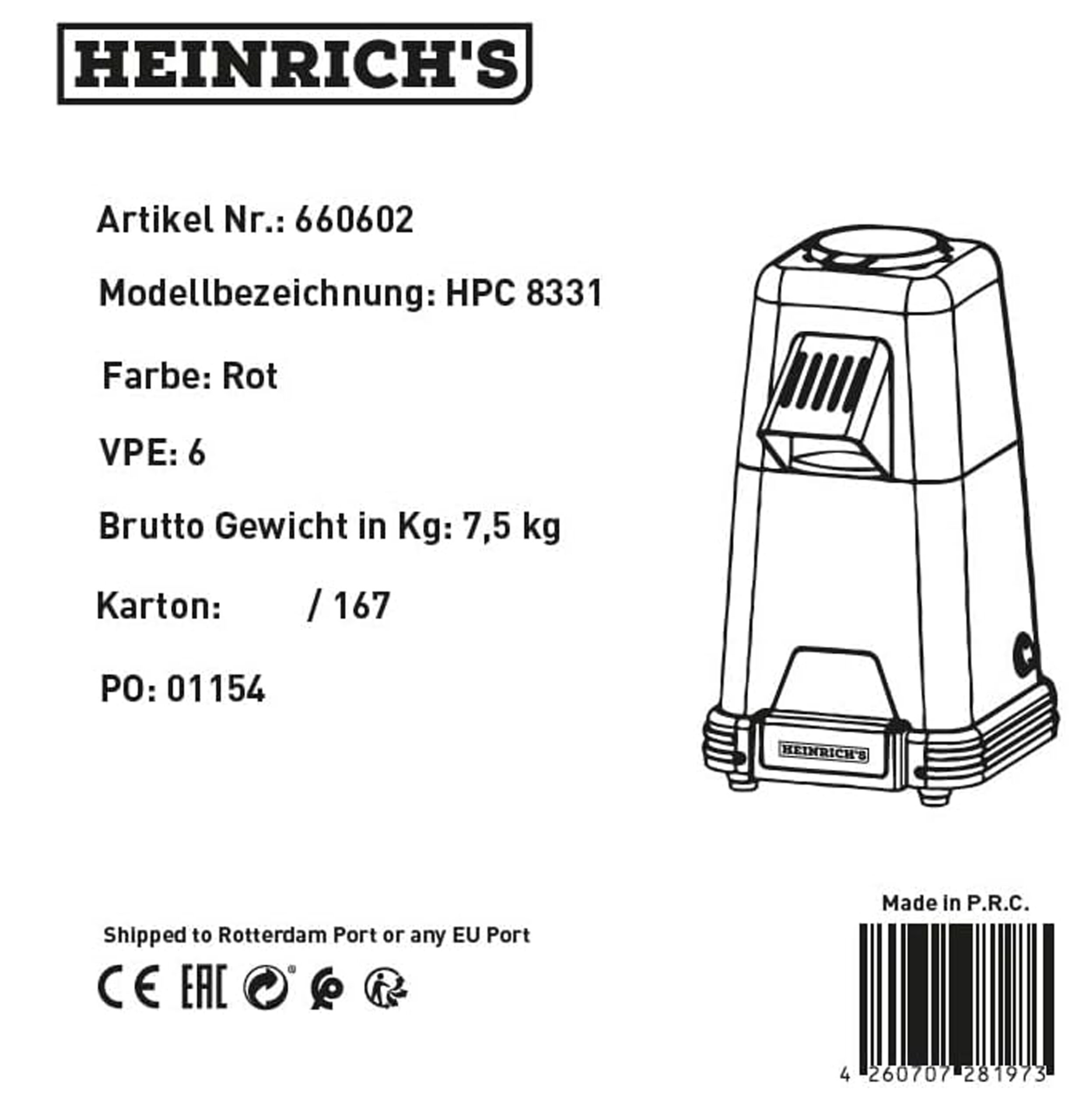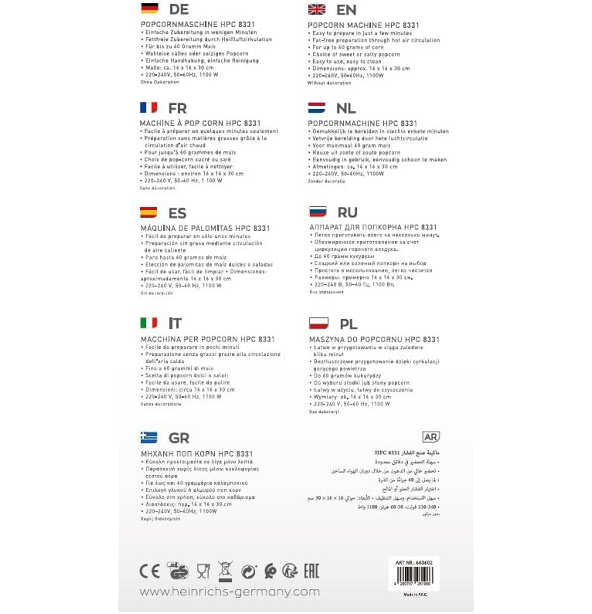 آلة صنع الفشار من هاينريش، جهاز تحضير الفشار بدون دهون أو زيت، يعمل بالهواء الساخن، تحضير سريع وسهل، سهلة التنظيف، وجبة خفيفة صحية مع السكر أو الملح، مزودة بملعقة قياس، بقدرة 1100 واط – موديل HPC 8331
