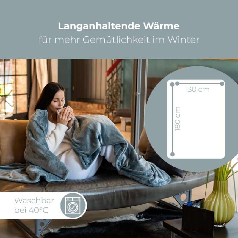 • بفضل التسخين السريع وقدرة 180 واط، توفر البطانية الدفء المطلوب بسرعة، وتغطي مساحة واسعة بحجم تقريبًا 130 × 180 سم.