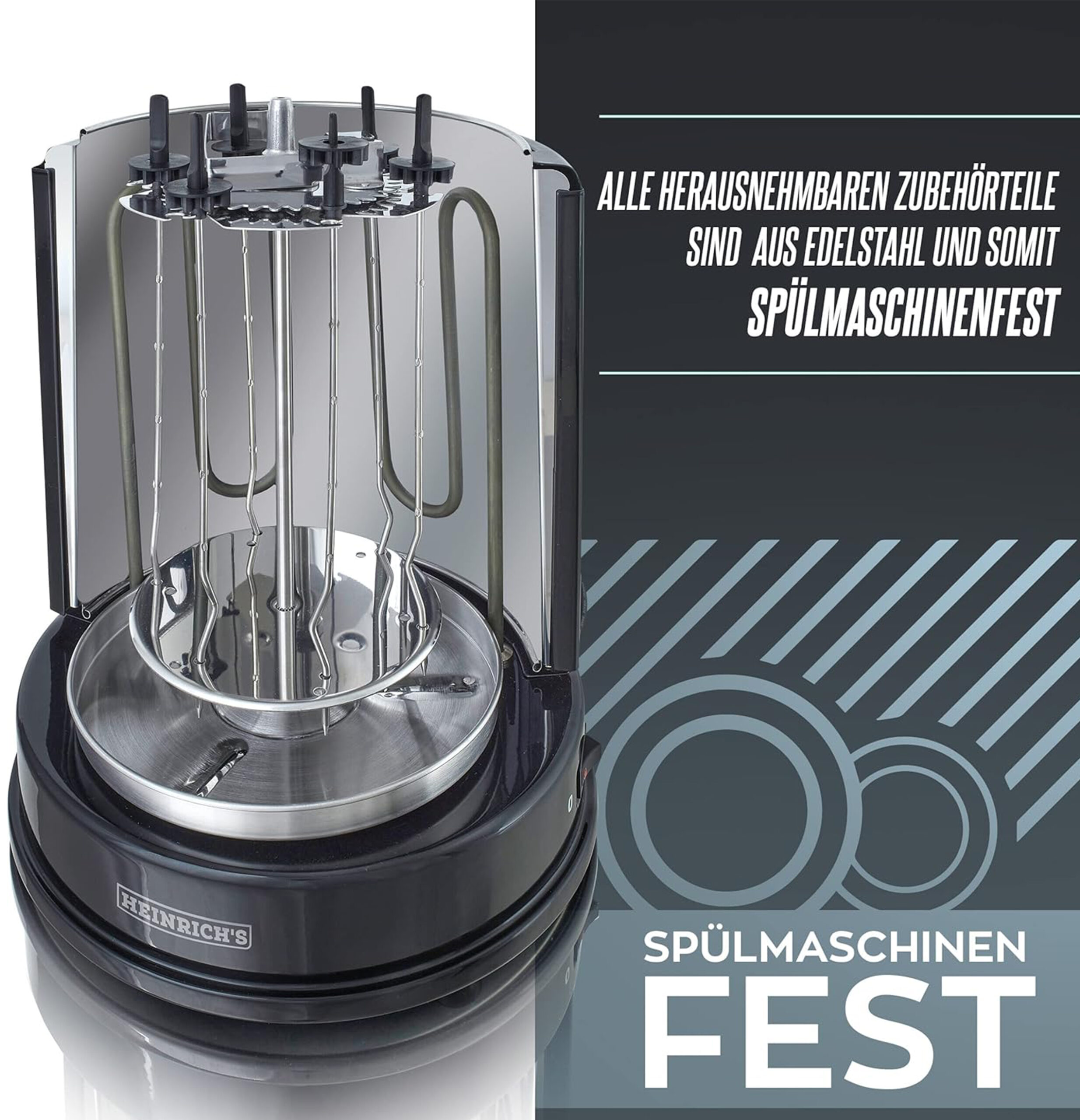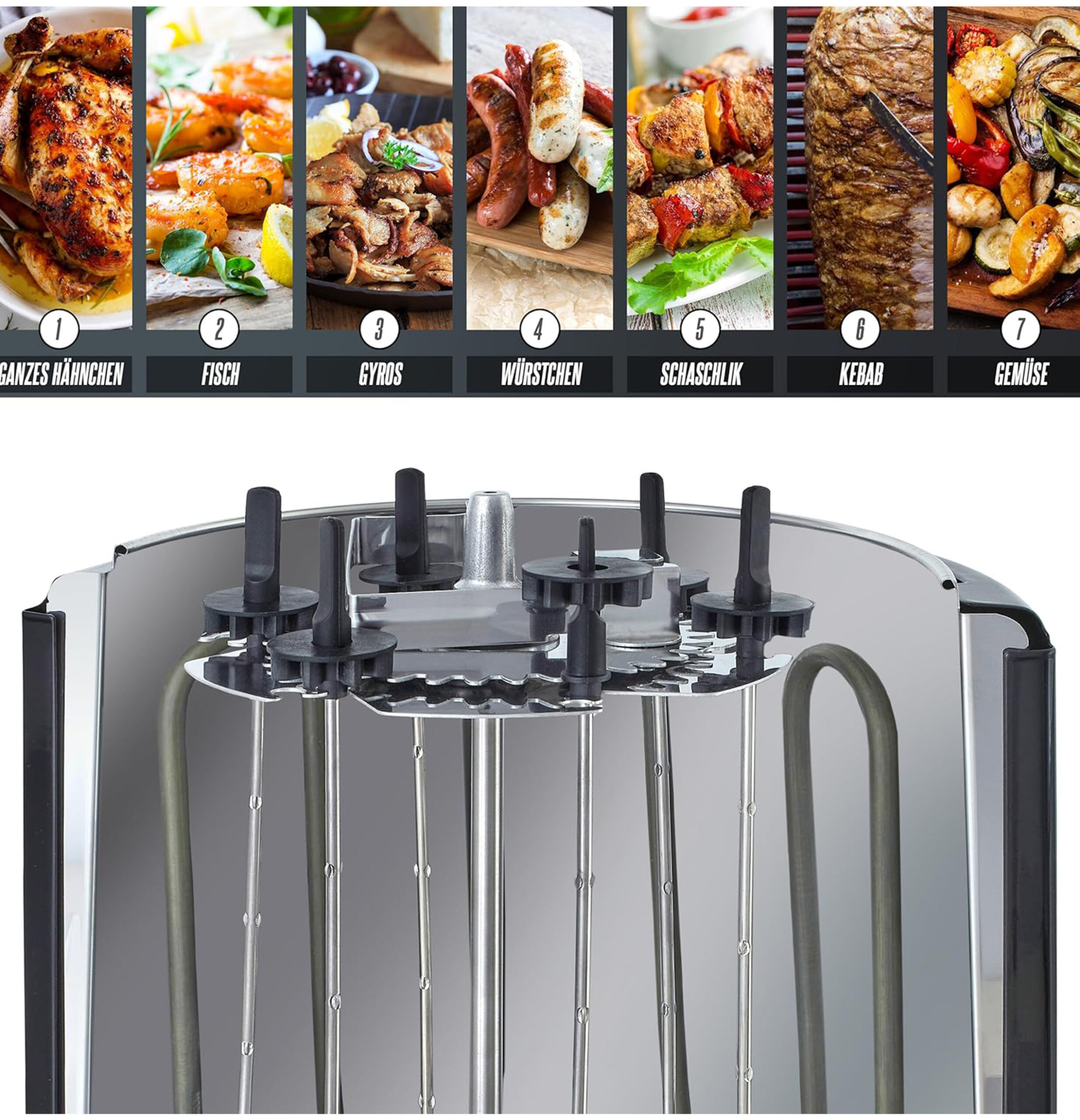 دوران مزدوج: بفضل الدوران المزدوج داخل الشواية نفسها وكذلك دوران الأسياخ حول محورها الخاص، ستحصل على تجربة شواء مثالية ومتجانسة.