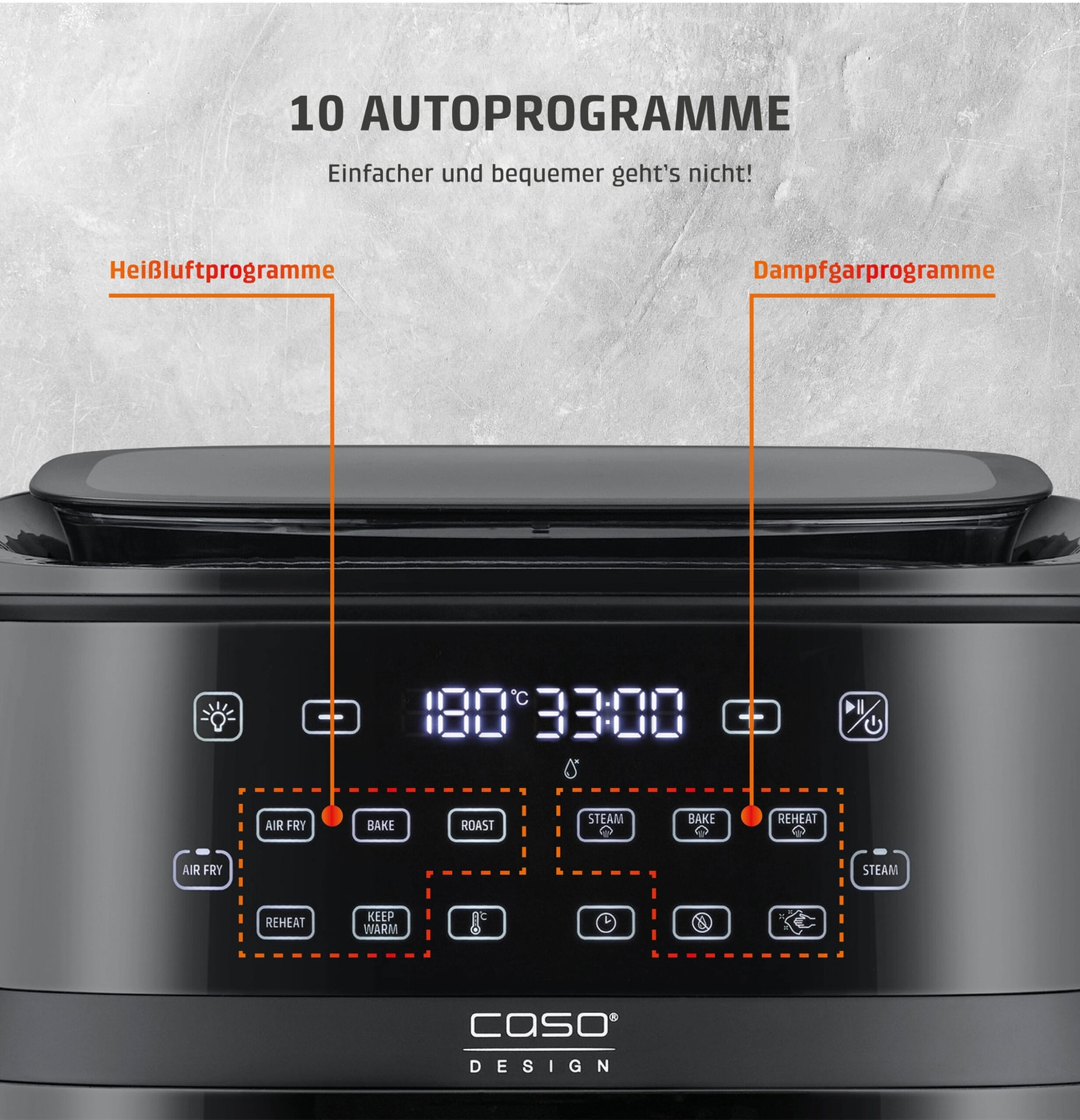 - 10 preset programs in 2 categories (AirFry and Steam)