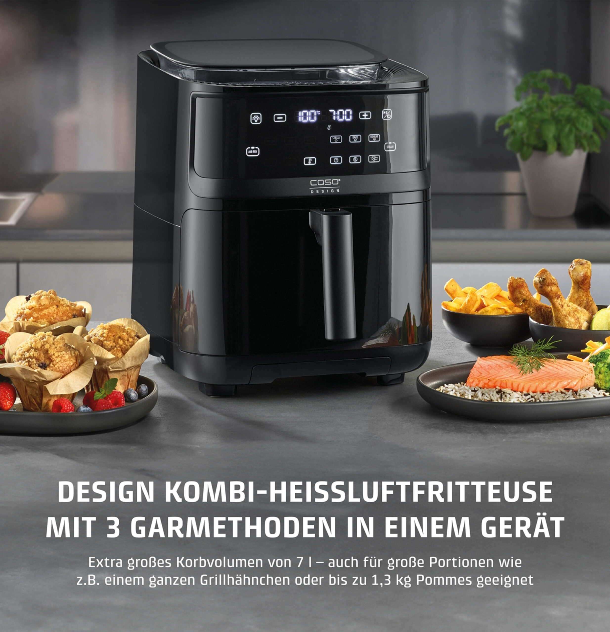 - Extra large basket volume of 7 l – also suitable for large portions such as a whole grilled chicken or up to 1.3 kg of fries