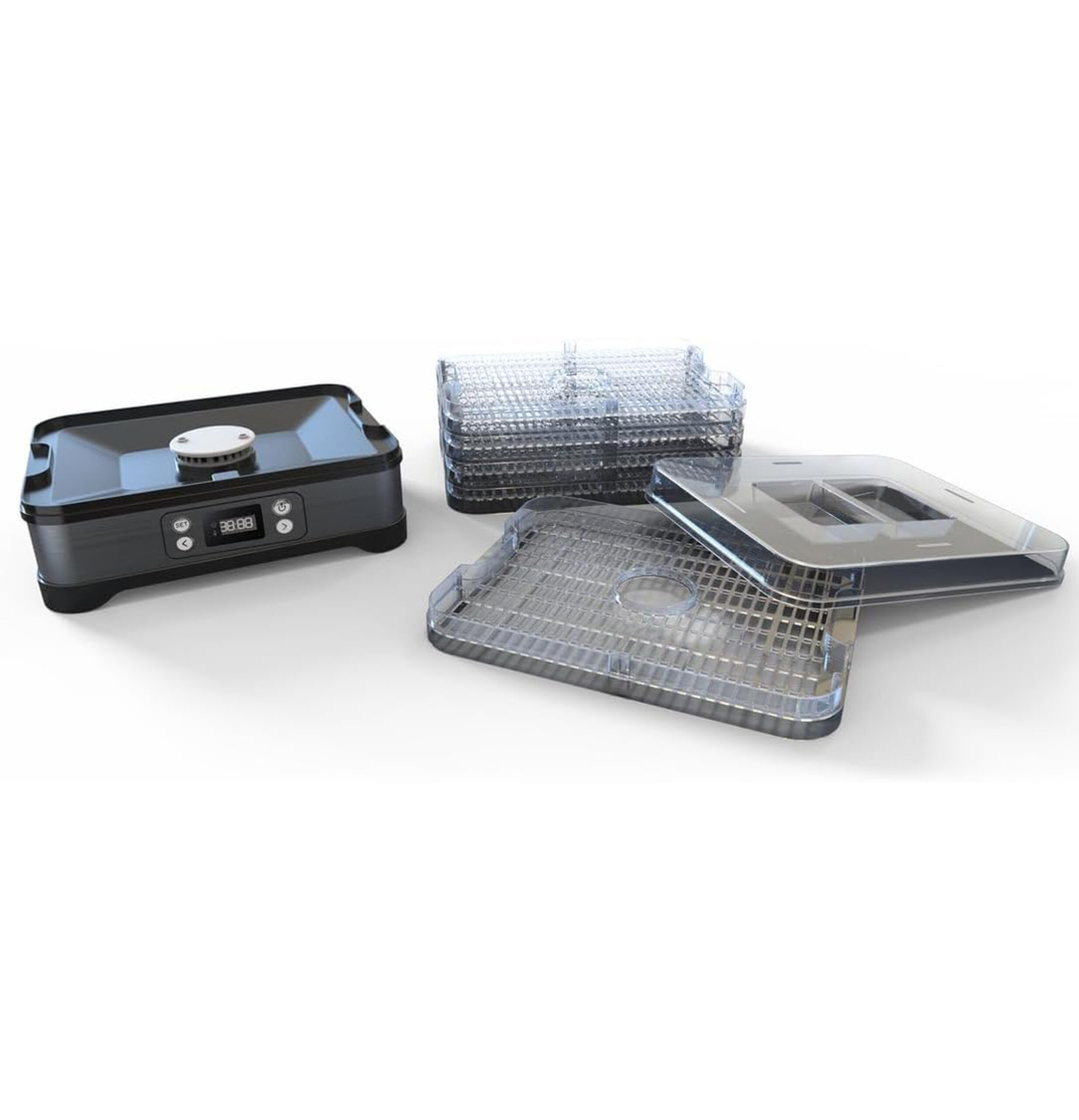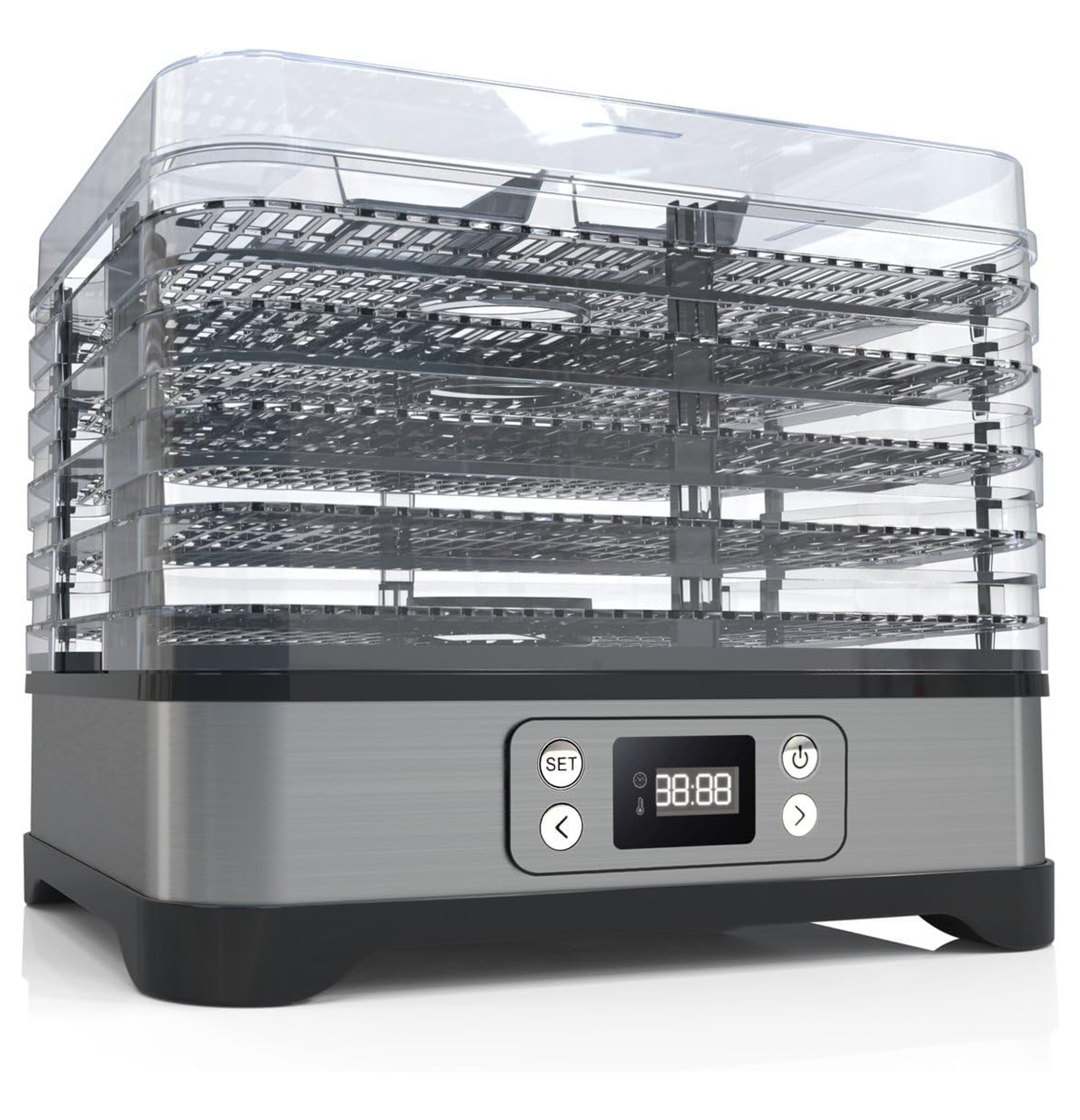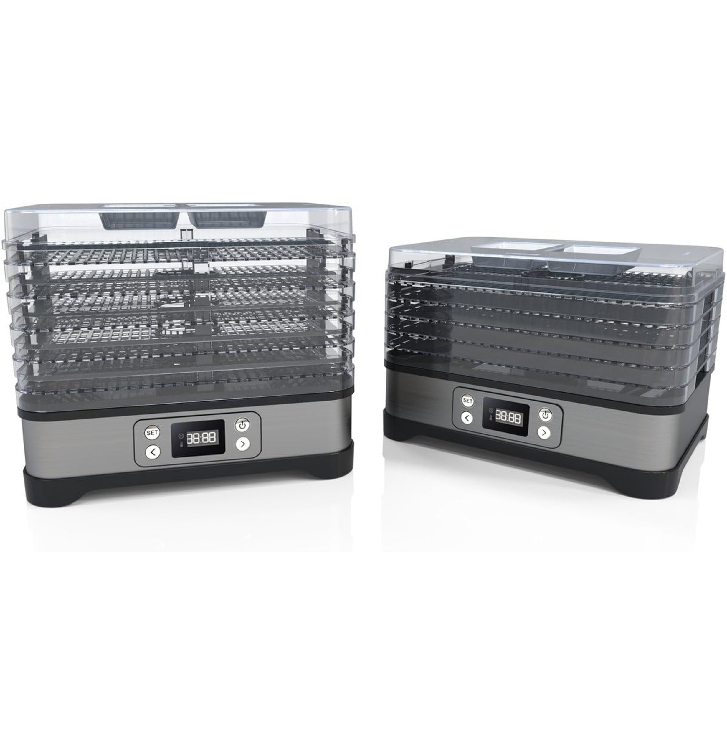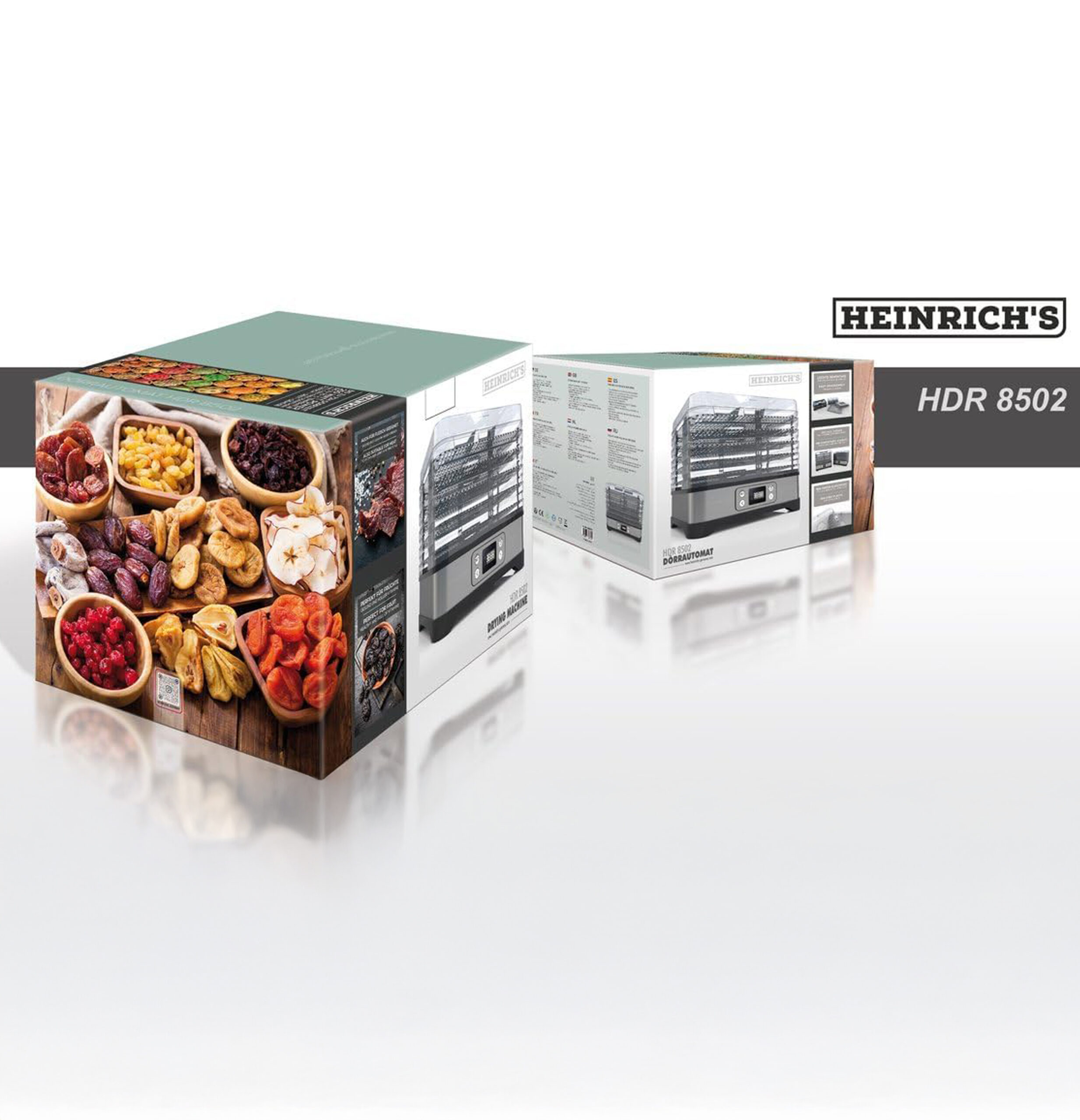 The HEINRICH S HDR 8502 is a powerful dehydrator that is ideal for gently drying foods, especially mushrooms. With a power of 250 watts, it enables efficient drying and offers space for up to six drying trays, allowing for flexible use. The machine is made from BPA-free plastic, making it a safe choice for food processing. Its compact dimensions of 25 cm in length, 32 cm in width, and 21 cm in height make it a practical device that fits in any kitchen. The appealing color scheme in black and silver harmoniously blends with various kitchen designs. The HEINRICH S HDR 8502 operates on a voltage of 220 to 240 V, providing reliable performance. This device is an excellent choice for anyone looking to make their own dried foods, offering easy handling and an effective drying method.