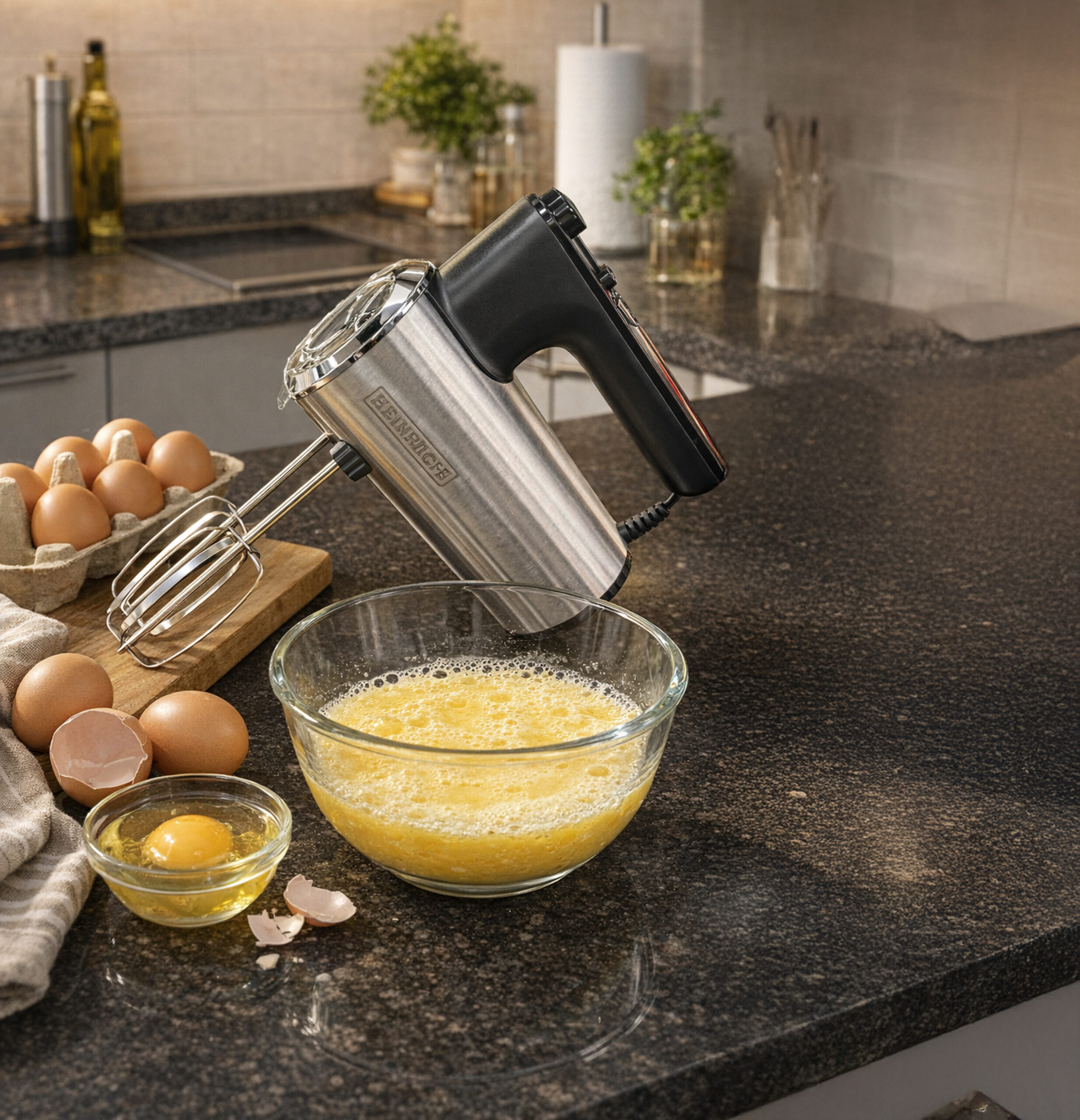 This hand mixer is designed for preparing a wide range of dough, cream, and pastry mixtures. With its high power and ergonomic design, it can be used both at home and in professional environments.