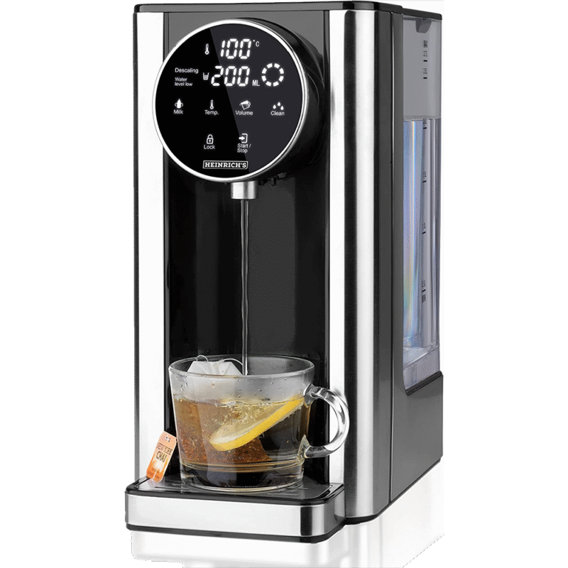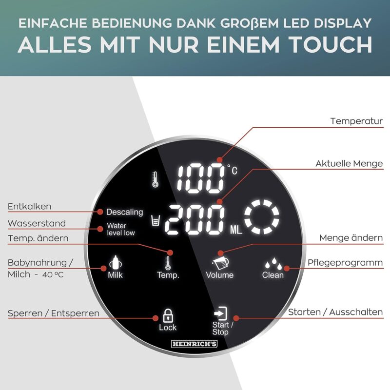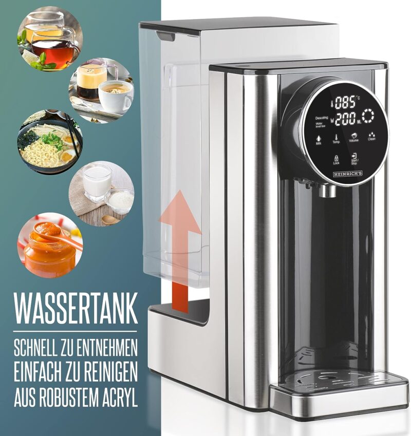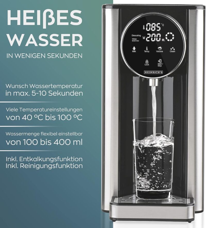 High quality: the compact hot water dispenser is made of high-quality stainless steel. Perfect for preparing tea, soluble coffee, and baby food according to your wish, different temperature settings: 40-100°C and a direct dial button for accurate preparation of baby food (40°C). Large tank: the constant filling of the water tank is saved thanks to a 2.7 litre tank. You can choose the desired amount of water according to your wishes using the LED touch display between 100 – 400 ml. In addition, a display will light up on the display if there is too little water in the tank. Energy-saving of over 50% due to the powerful 2600 watts you get hot water in just 5-10 seconds in the desired temperature between 40°-100°C. Cleaning made easy. This device is also equipped with a descaling and cleaning button. So you do not have to decalcify the device by hand, as with other devices