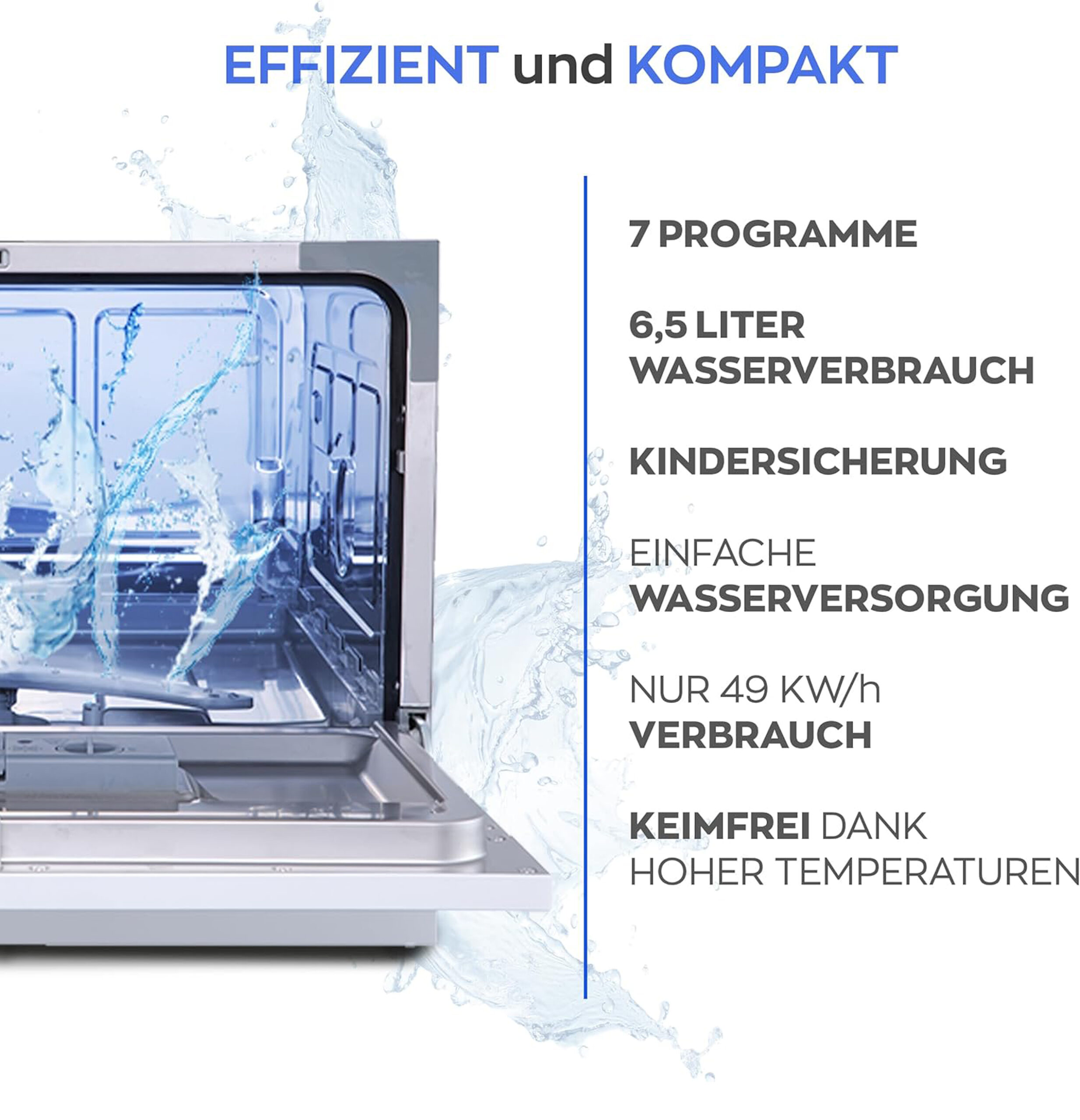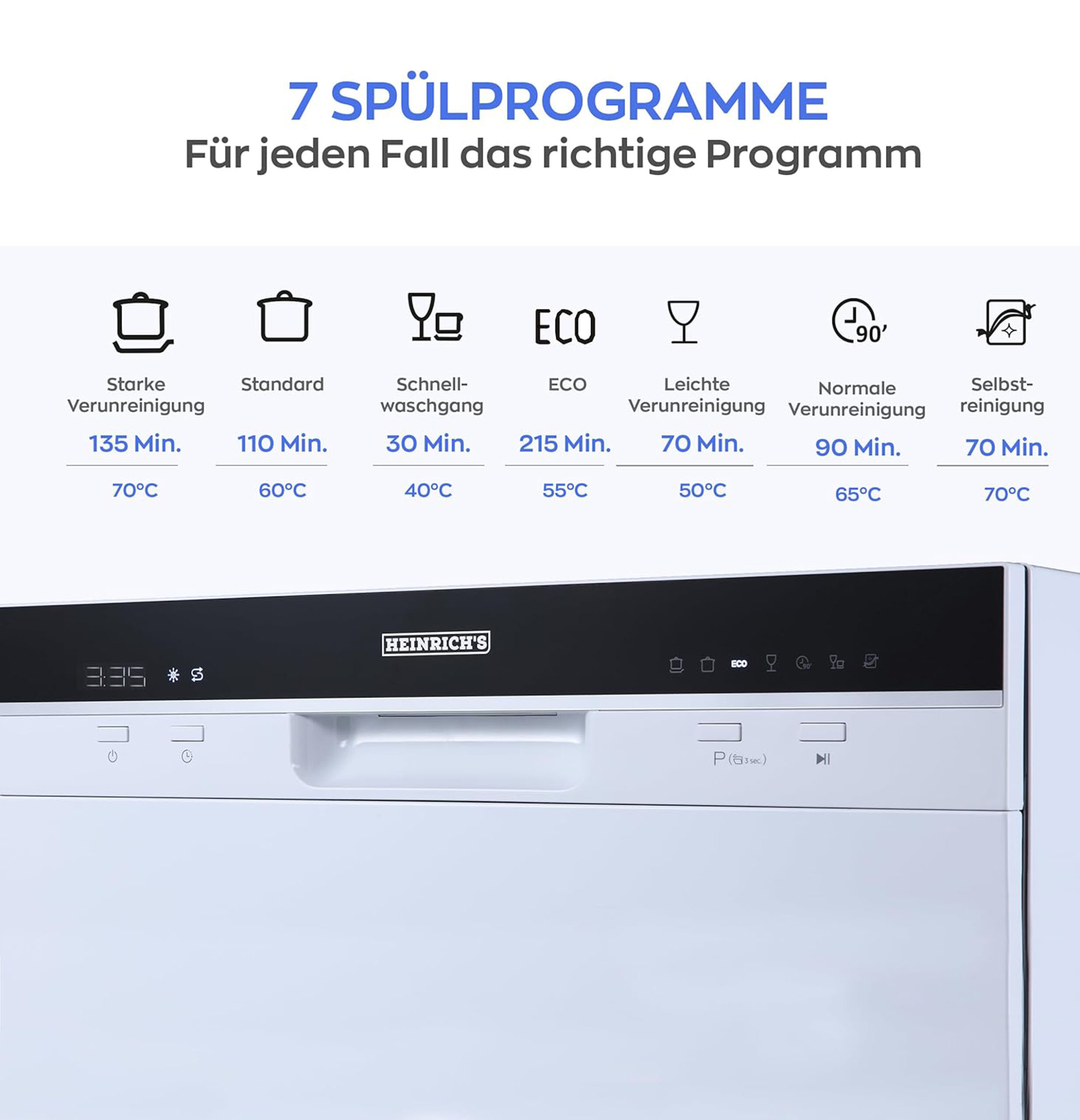 - 7️⃣ 7 programs & functions: water tank with 6.5L water capacity and direct tap connection. Thanks to the 360° cleaning cover, you can rinse your dishes thoroughly and cleanly. You have the choice of 7 programmes: ECO: 215 min., heavy soiling: 135 min., standard: 110 min., glass: 70 min., quick: 30 min., self-cleaning: 70 min., 90 min. Program