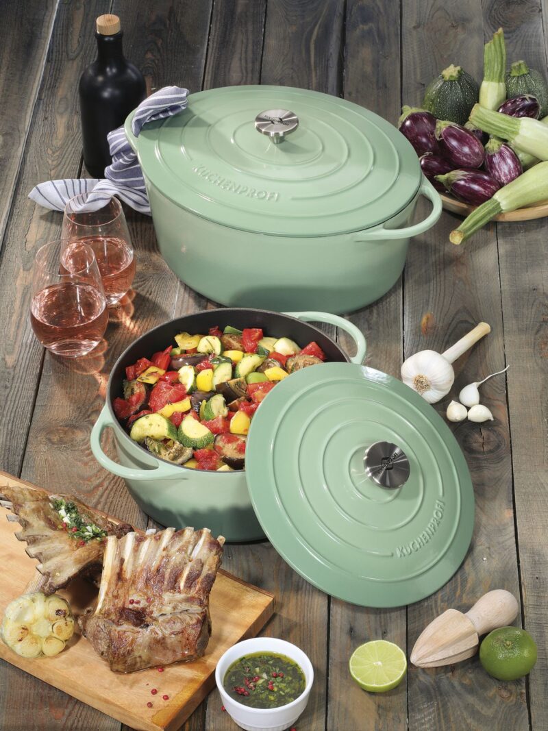 Sun-drenched vegetables, lamb from the highlands, fish and seafood – Provence offers it all. The cuisine of this southern French region is diverse, light, and healthy. The KÜCHENPROFI PROVENCE cast iron collection continues this tradition. The series is ideal for braising, simmering, boiling, roasting, and deep-frying. The cast iron absorbs heat quickly and distributes it evenly. This allows you to quickly reduce your energy consumption – saving energy and preserving the flavor of your food. PROVENCE cookware is suitable for all stovetop types, including induction, and the knobs are oven-safe up to 250°C. When served stylishly, this cookware adds a fresh touch to your table. The timeless yet sophisticated design, with its handy knobs and ergonomic handles, is a real eye-catcher. Now let your imagination run wild. How about a mussel stew with pollock, leeks, potatoes, and a dash of vermouth? Bon appétit!