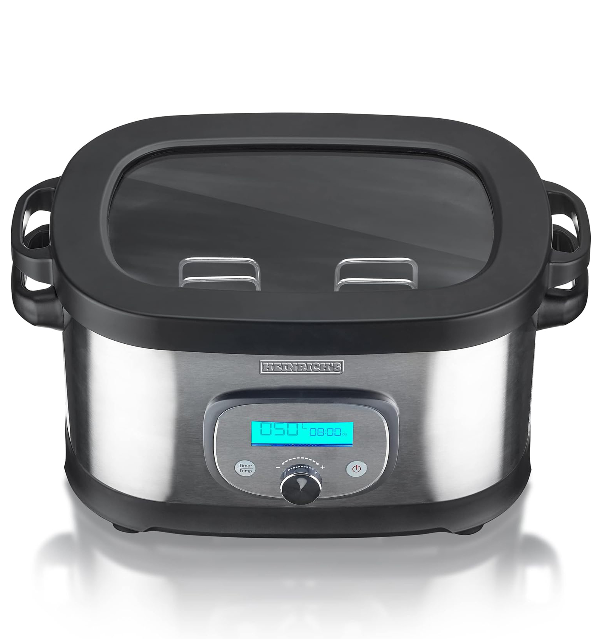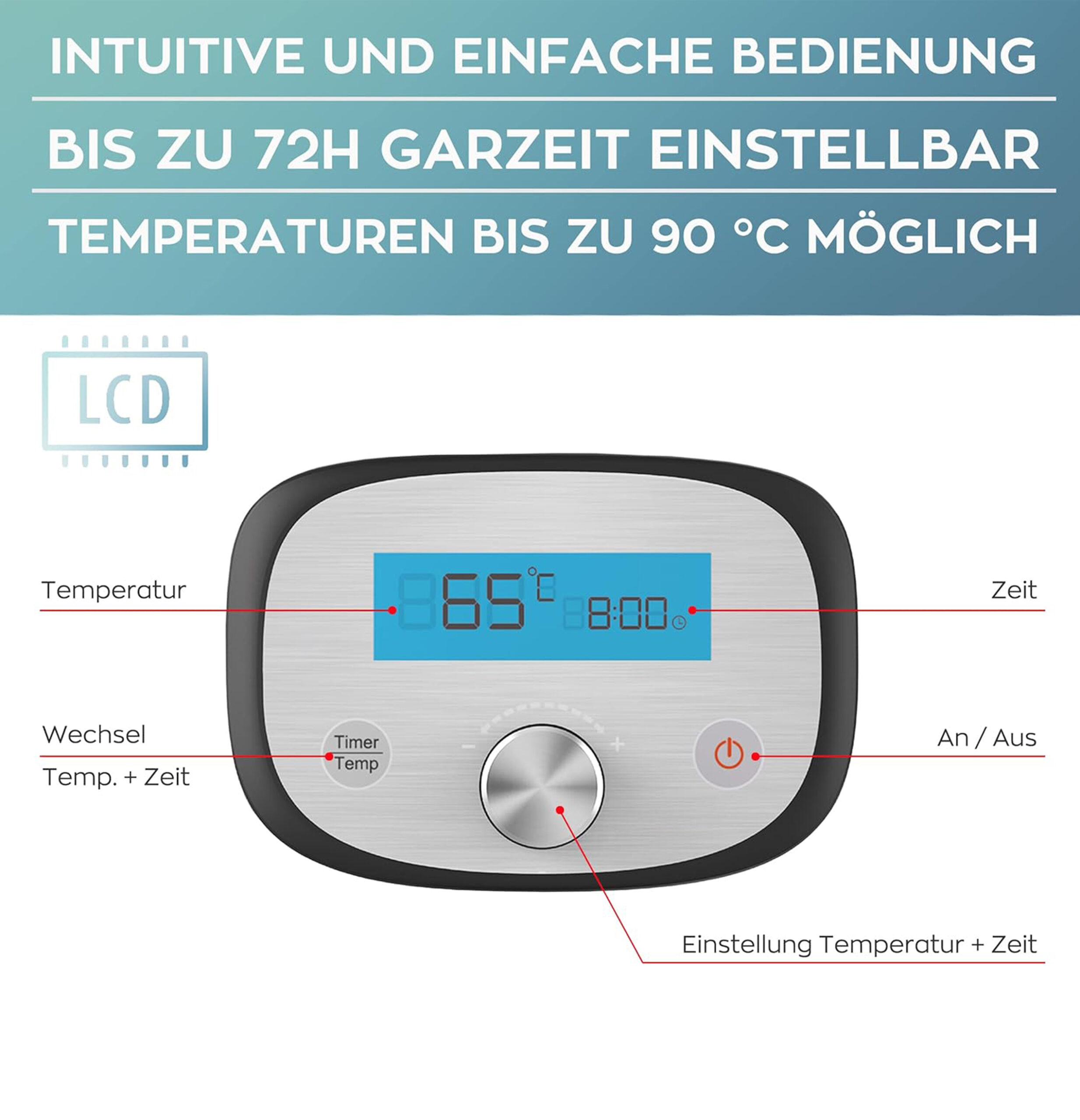 Design and functionality: the stainless steel case with blue LCD display shows the current temperature and the adjustable timer up to 72 hours. Thanks to the high-quality function keys it is easy to use. Each press of the button is confirmed with a beep when it is on. The metal frame provided facilitates the cooking process.