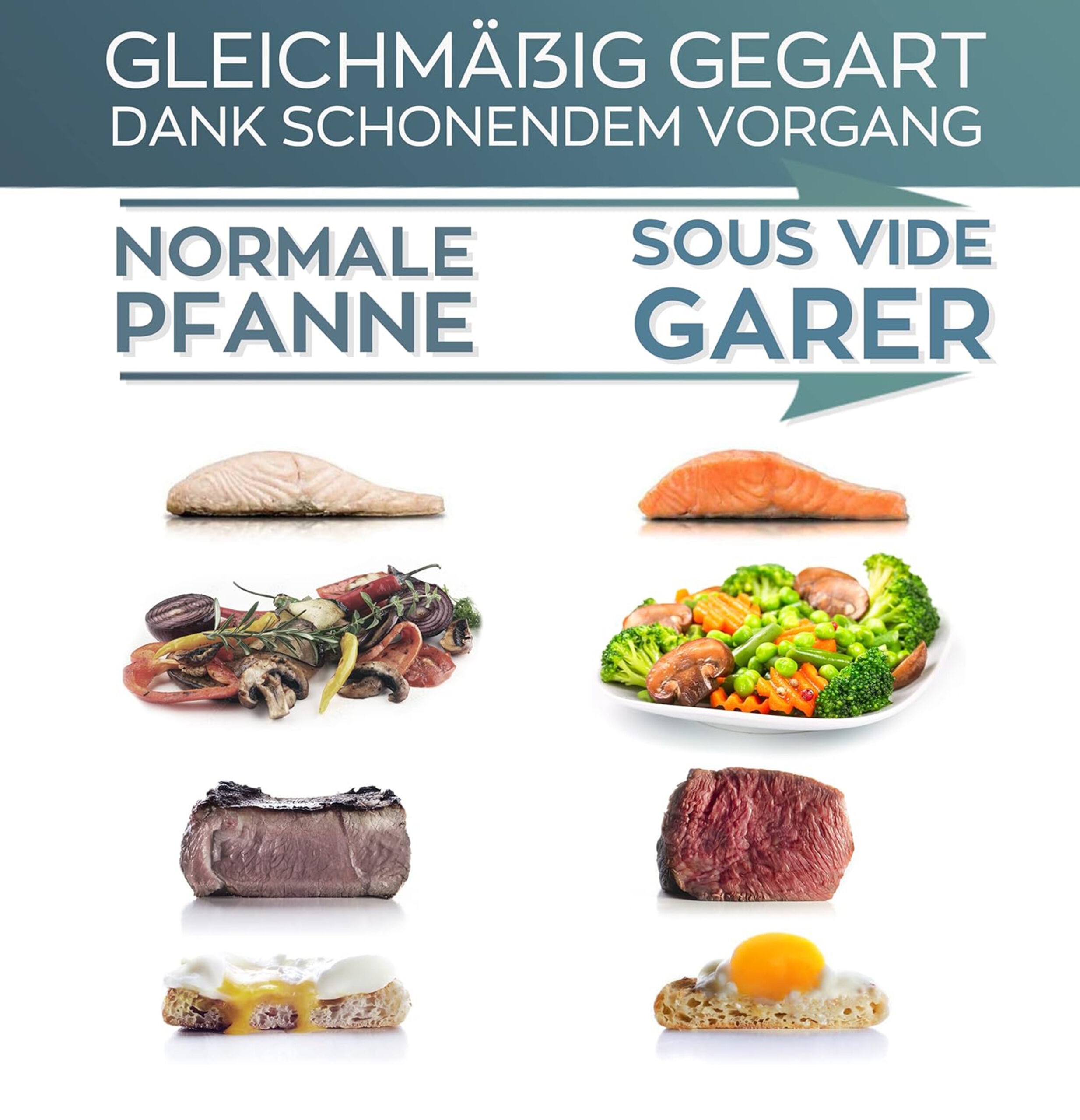 Star chef thanks to the guarantee of success: meat, fish and vegetables are cooked exactly to the point. With Sous-Vide cooking, cooking of food is excluded. By welding food, no liquids can escape and the vitamins and nutrients of meat and vegetables remain unaltered.