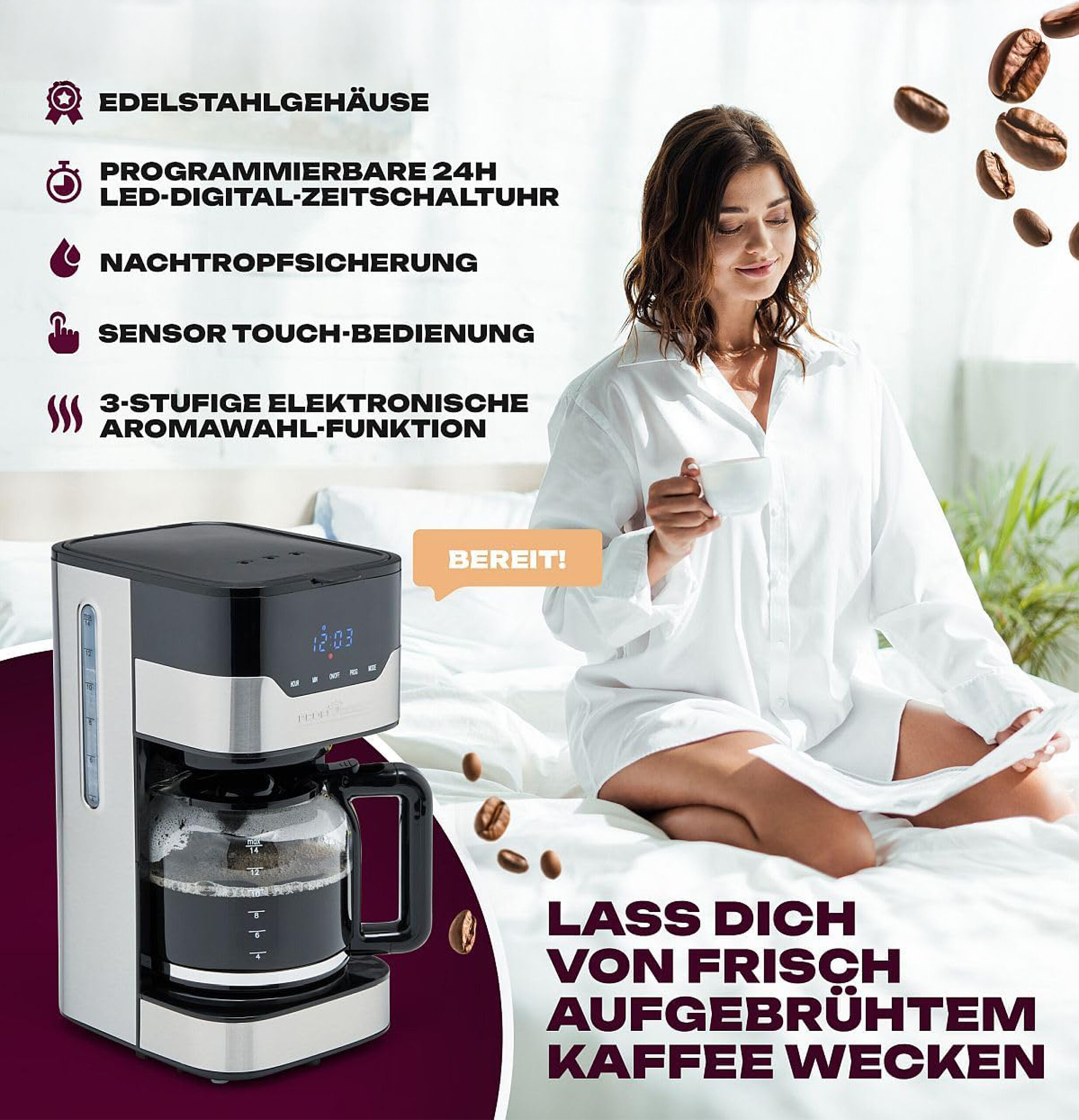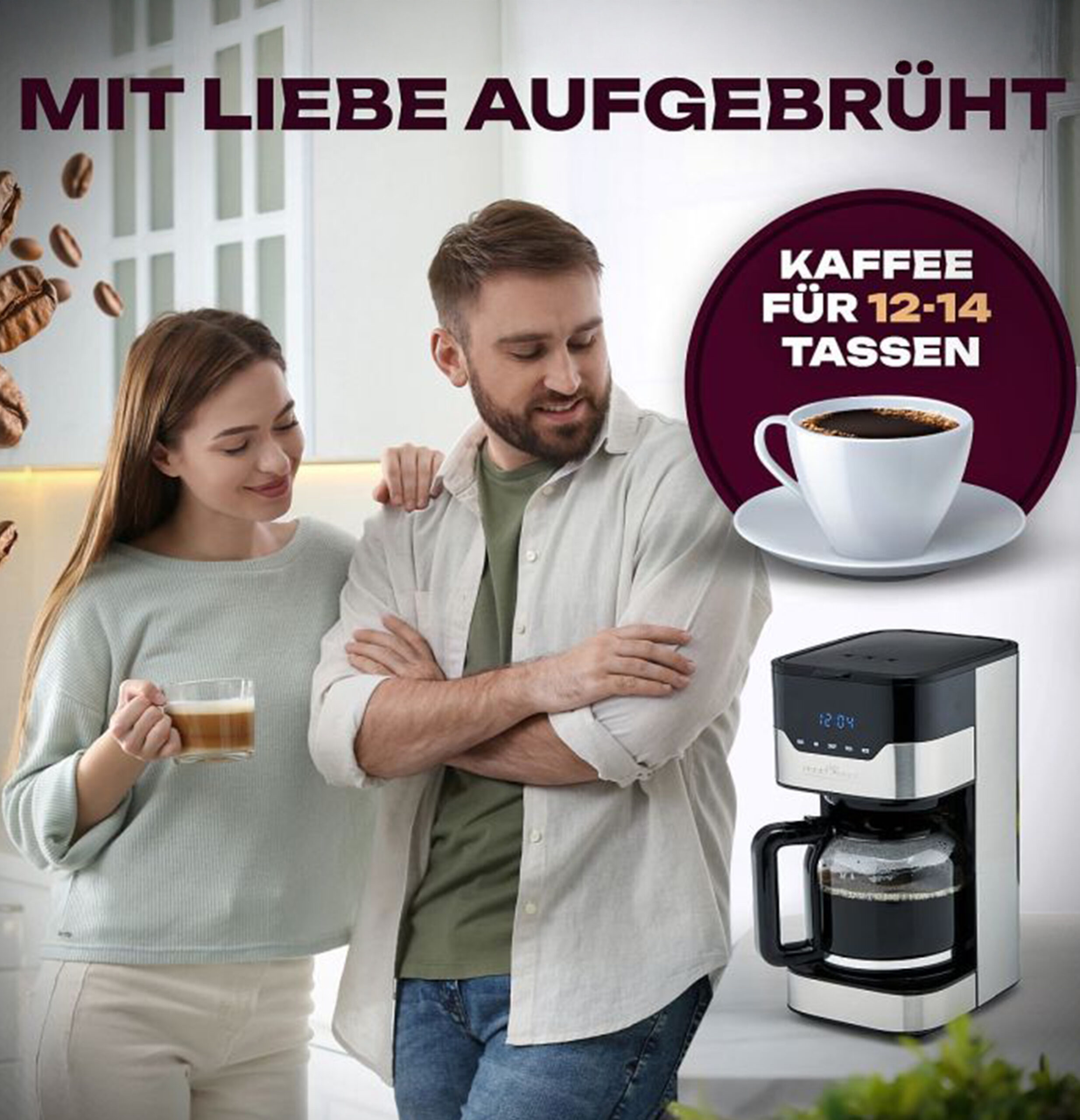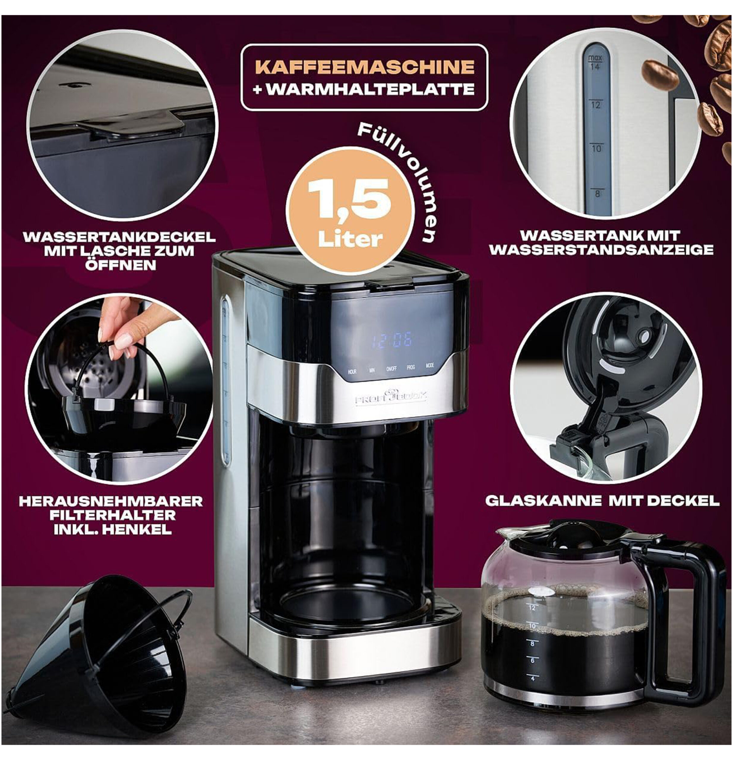 Enjoy aromatic, delicious coffee with ProfiCook.The powerful PC-KA 1169 coffee machine from ProfiCook for around 12-14 cups (around 1.5 liters ) brews aromatic coffee and sets new accents in your kitchen with its high-quality stainless steel housing and elegant design . The device has a drip guard that closes automatically when the pot is removed. This prevents annoying coffee drips on the hotplate . The hotplate has an automatic switch-off . In addition, rubberized feet ensure that the device does not slip . ProfiCook – highest quality in innovative design.