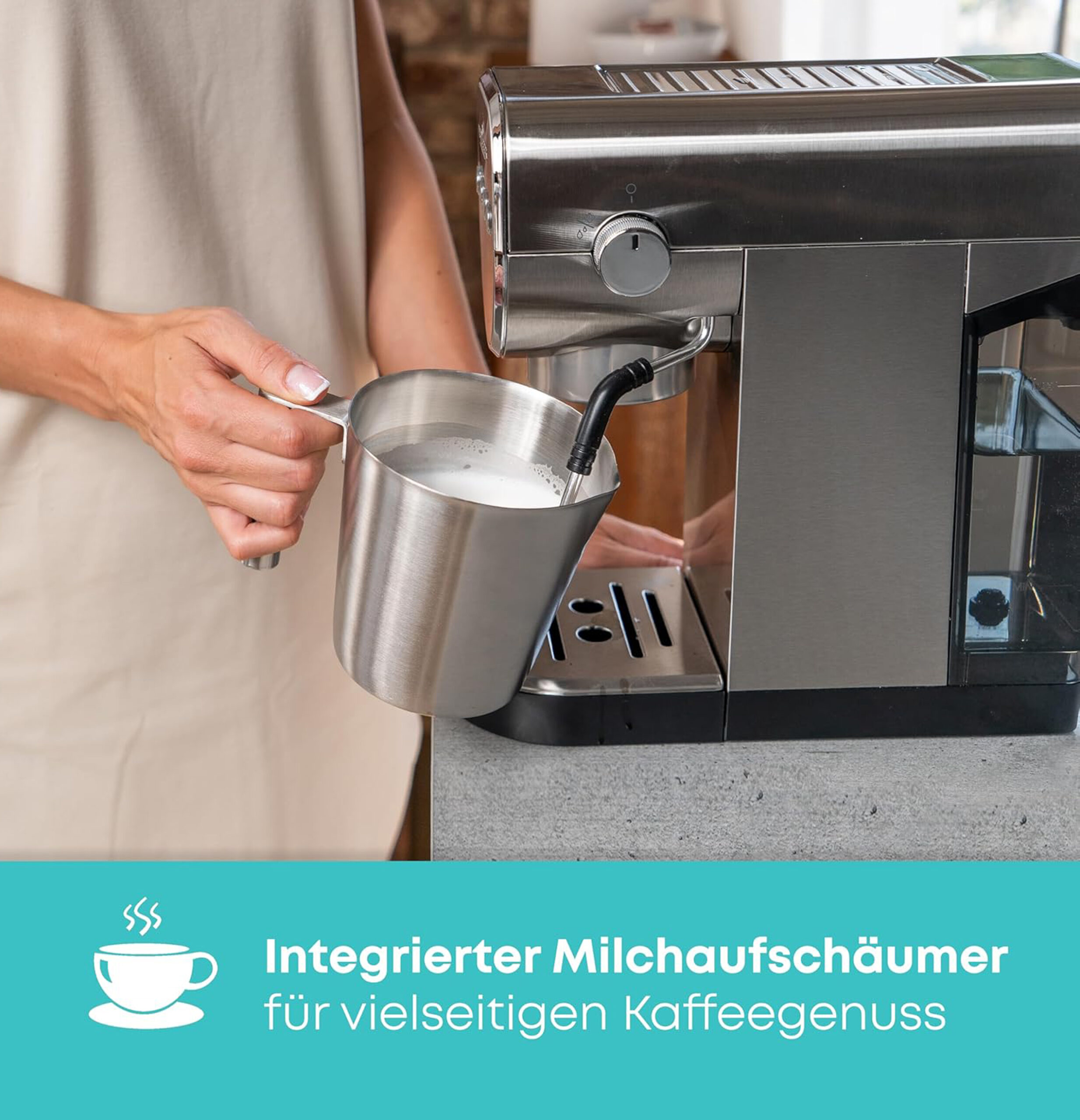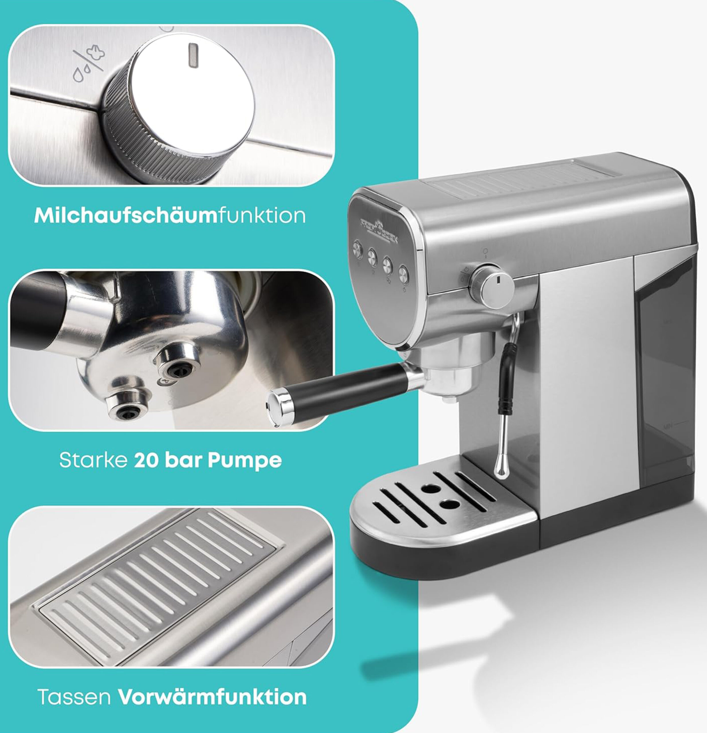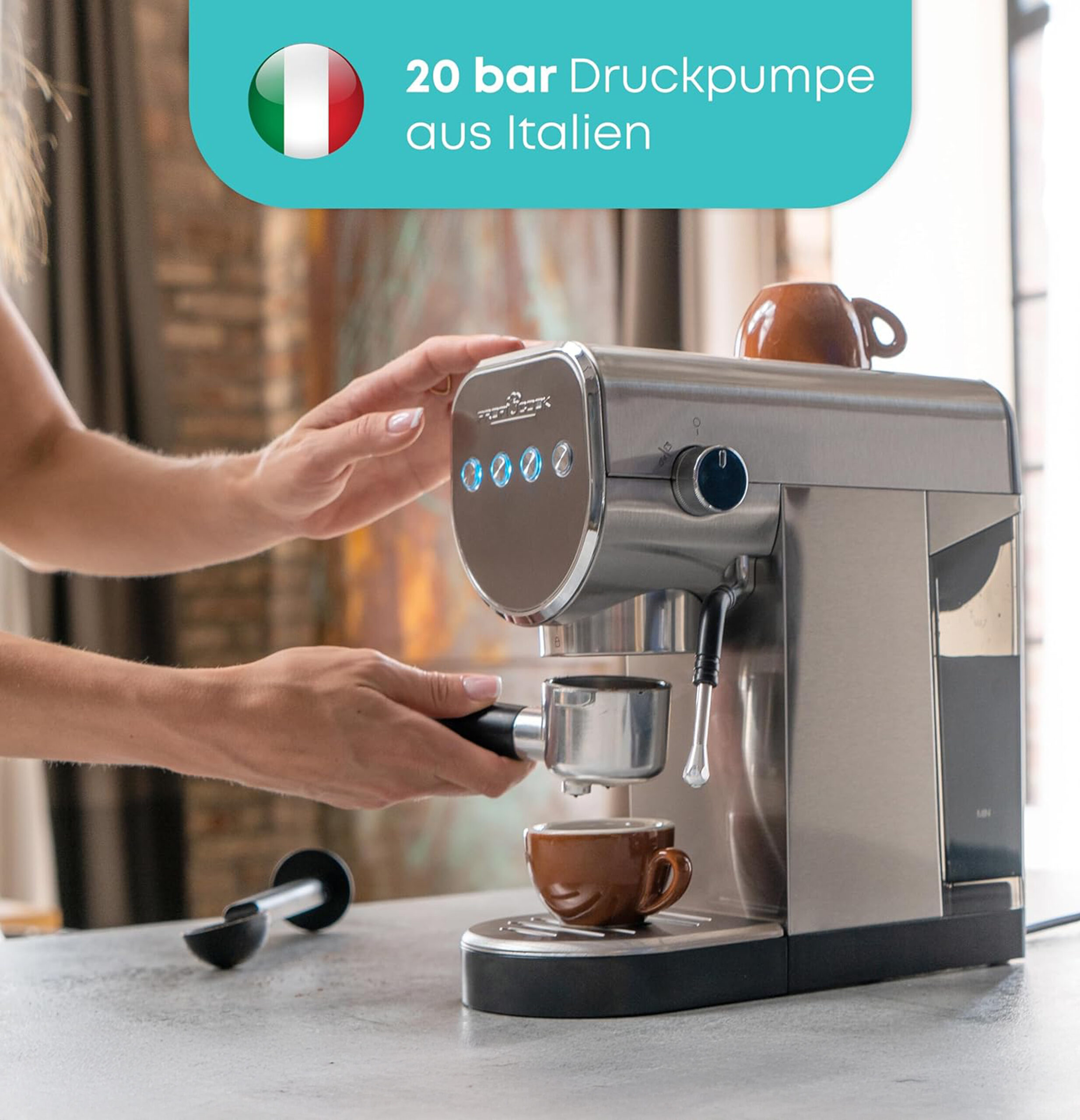 - 20 bar – The espresso machine from ProfiCook is equipped with an Italian professional espresso pump that generates a pressure of up to 20 bar, for aromatic espresso with perfect crema