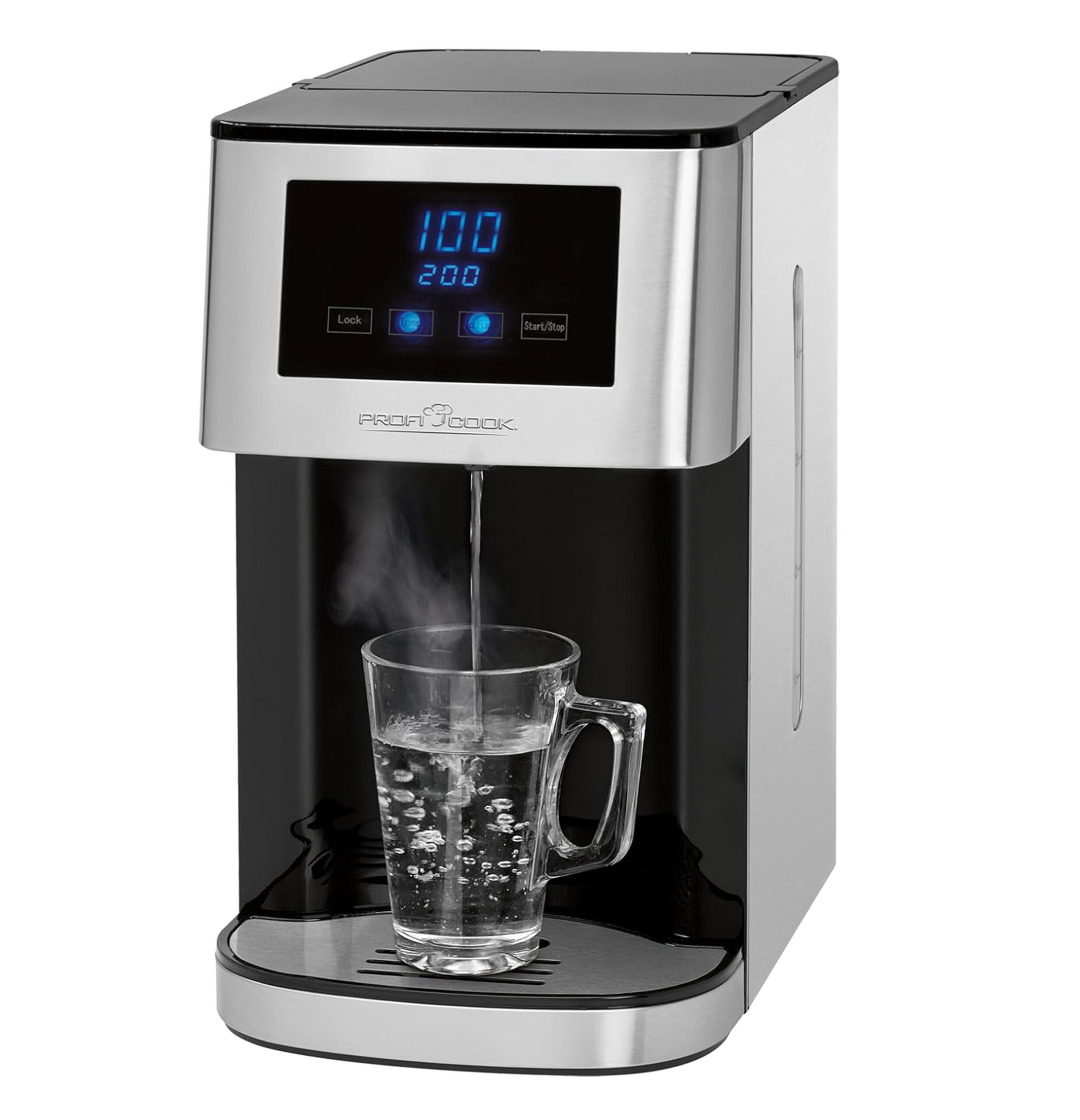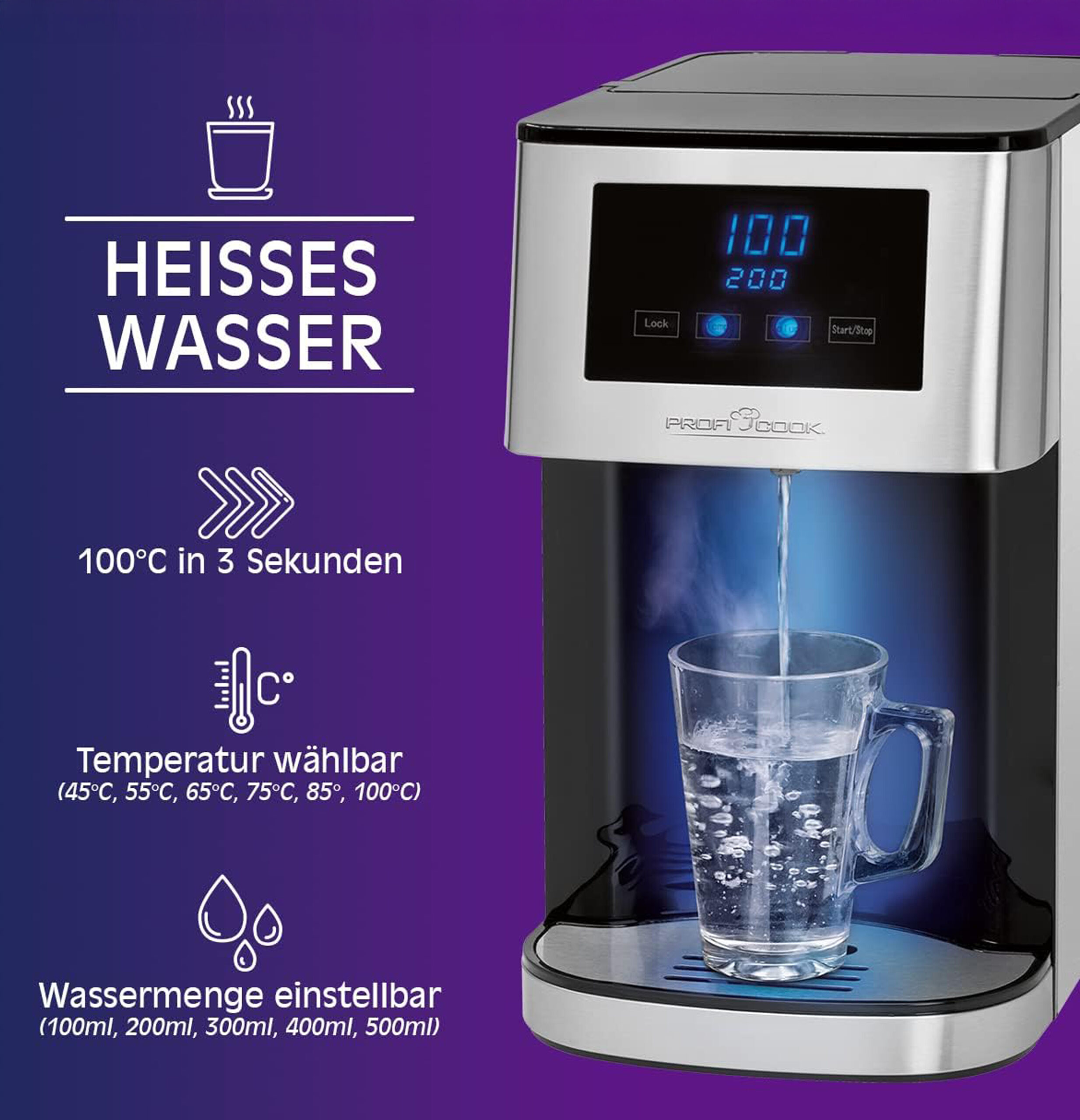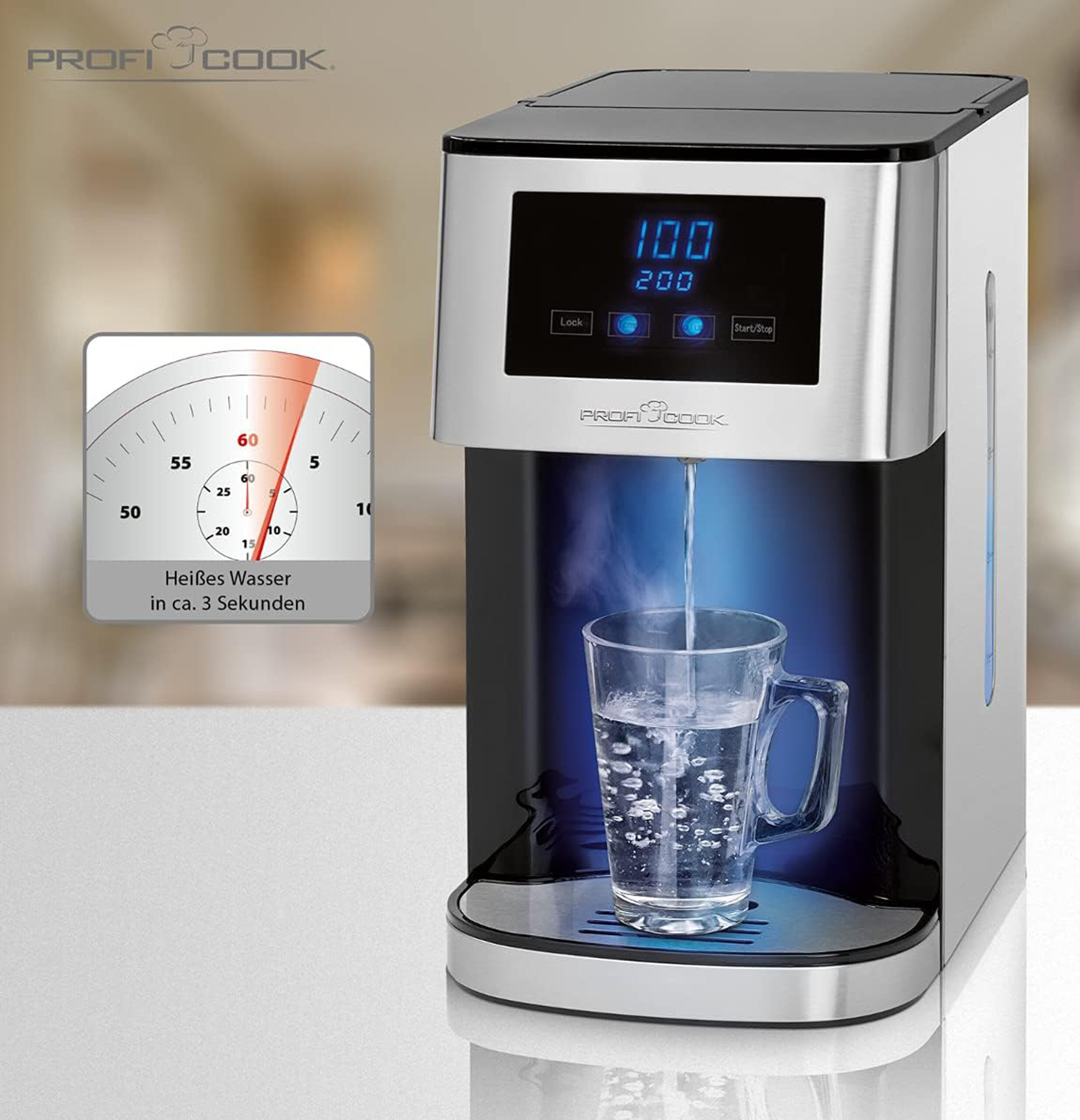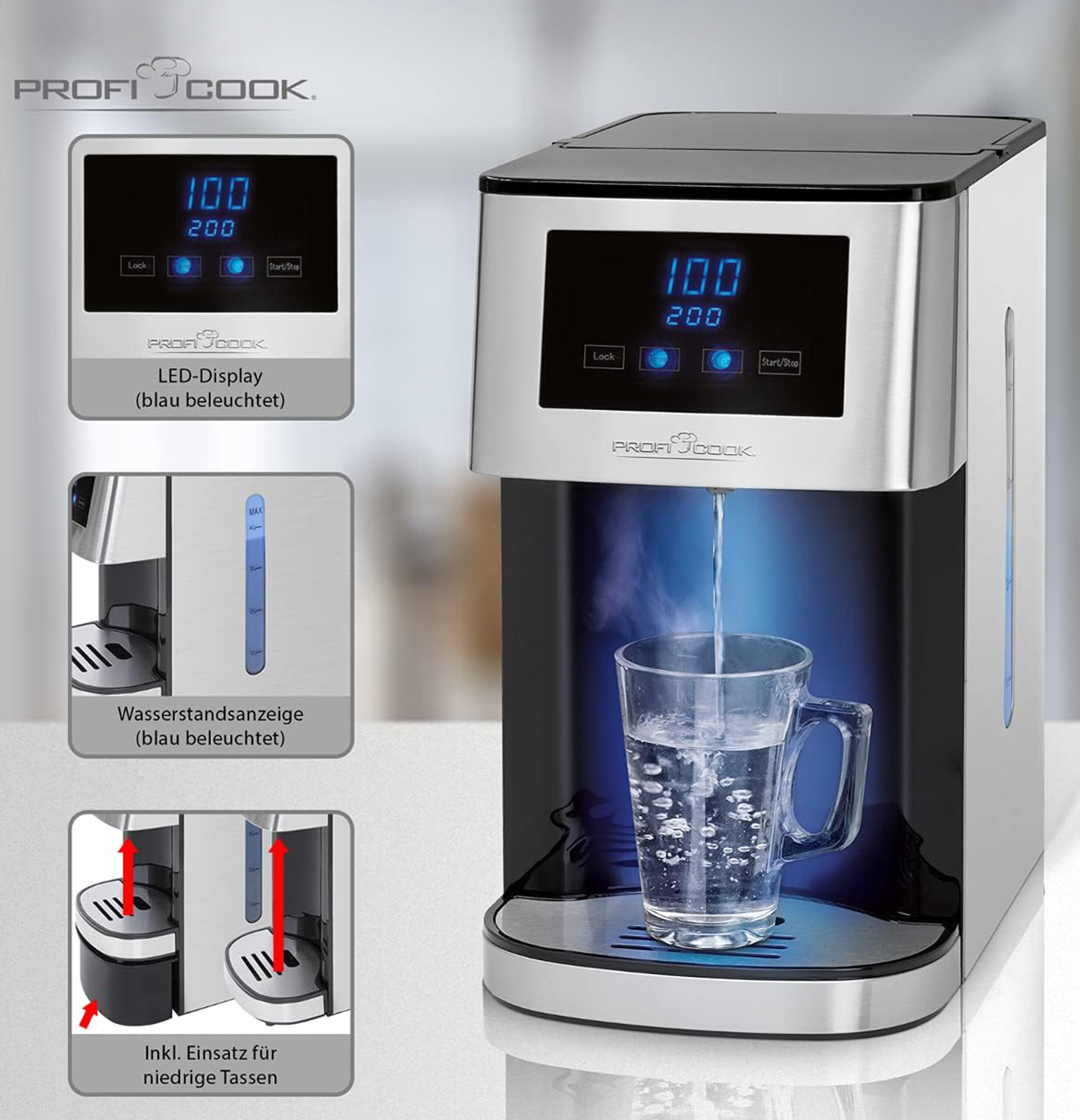 - DESIGN — The combination of stainless steel and black is timeless and fits perfectly into any kitchen. The modern, blue illuminated LED display and the stainless steel housing are further highlights of the ProfiCook hot water dispenser.