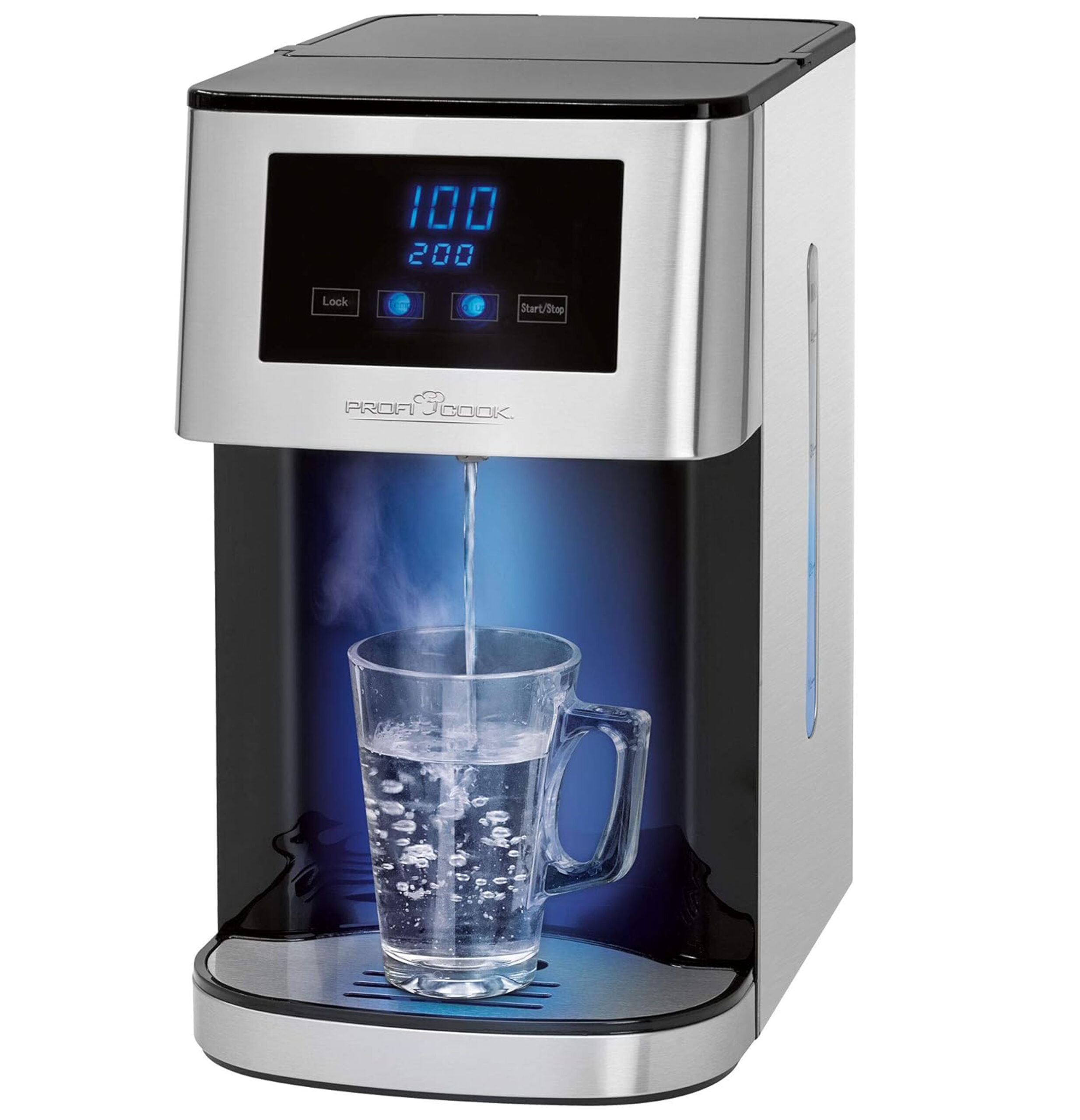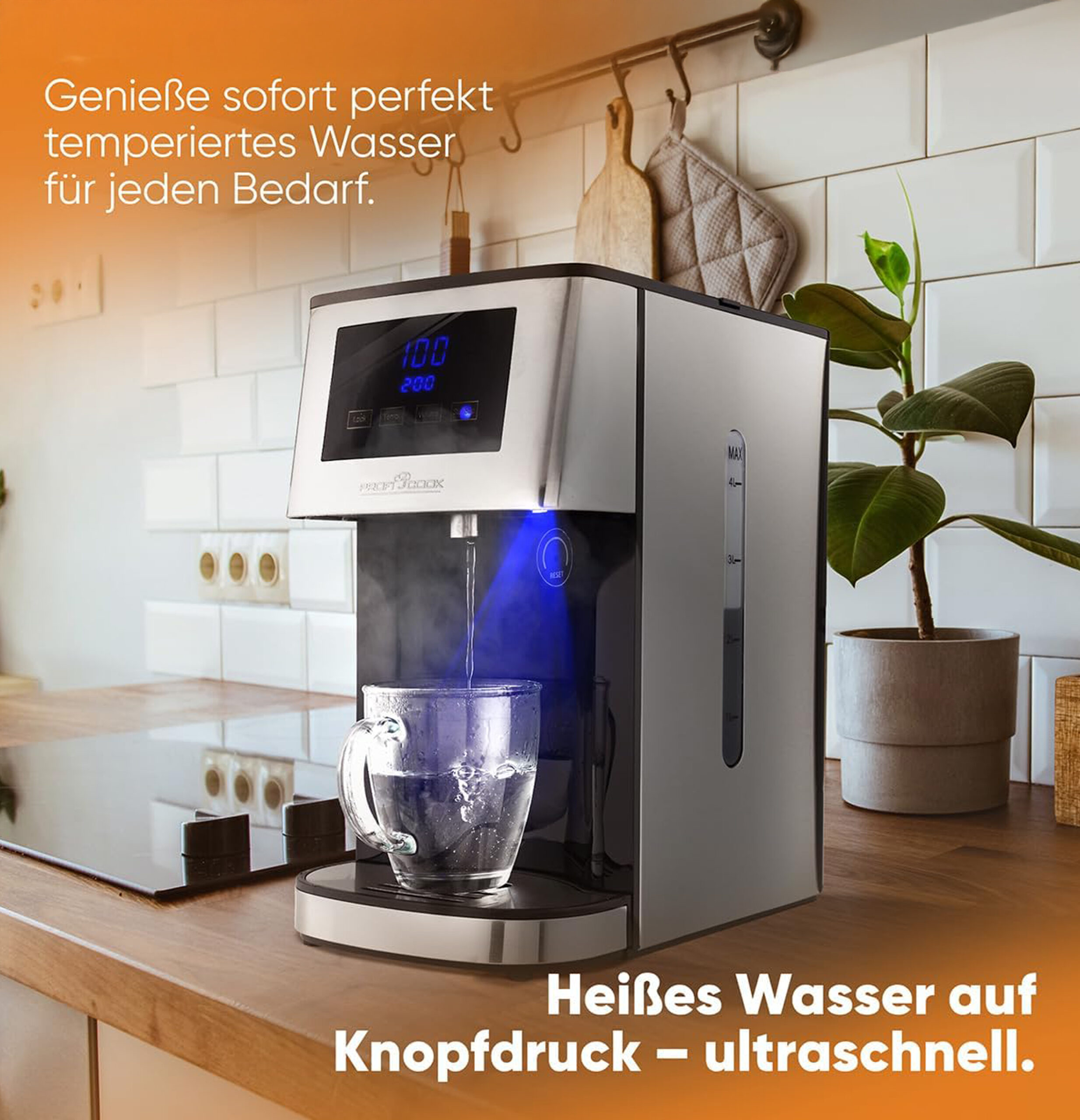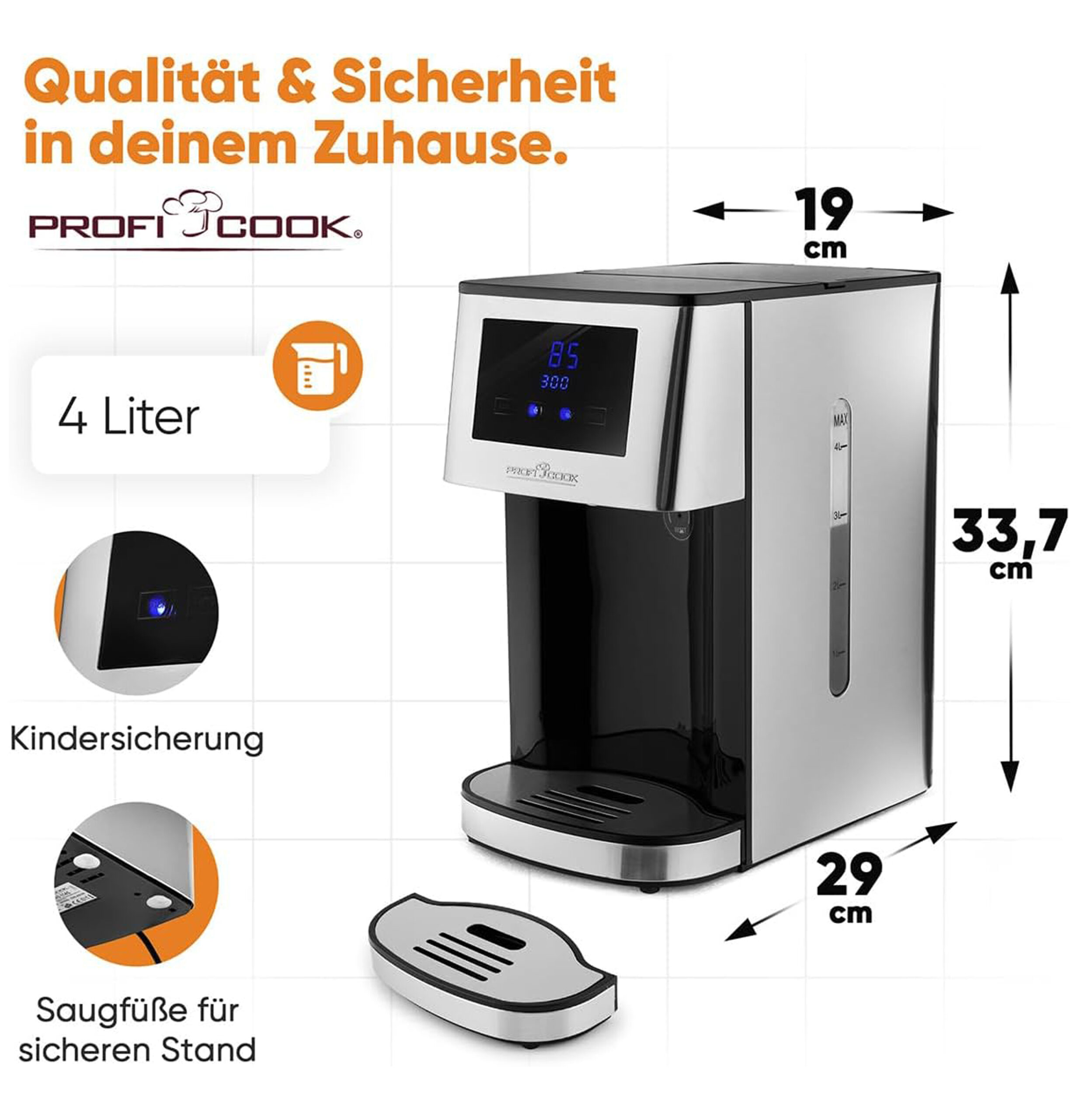 - DESIGN — The combination of stainless steel and black is timeless and fits perfectly into any kitchen. The modern, blue illuminated LED display and the stainless steel housing are further highlights of the ProfiCook hot water dispenser.