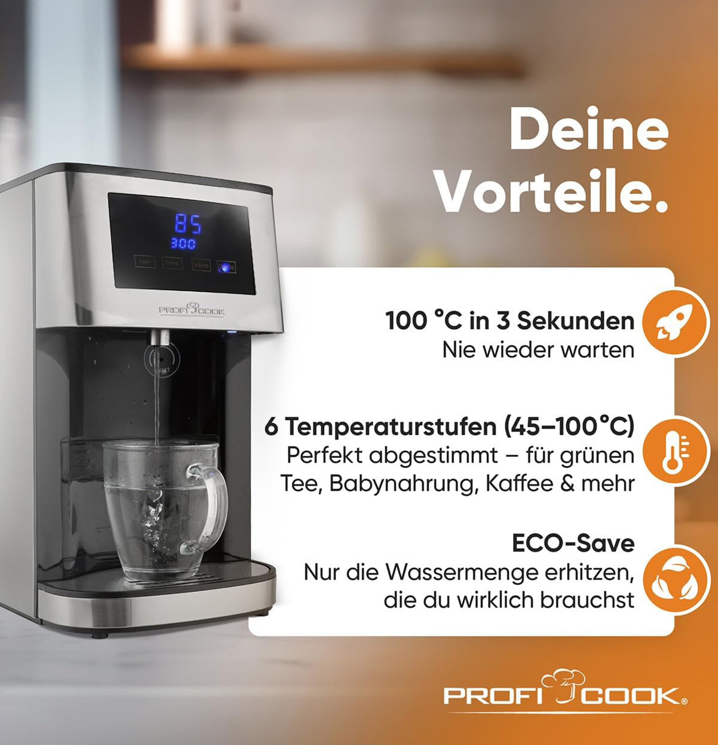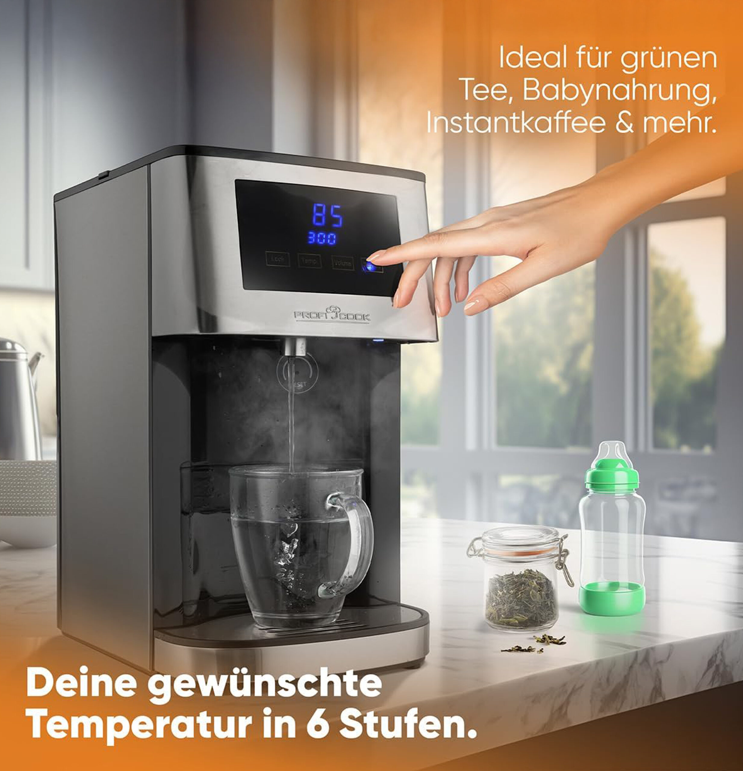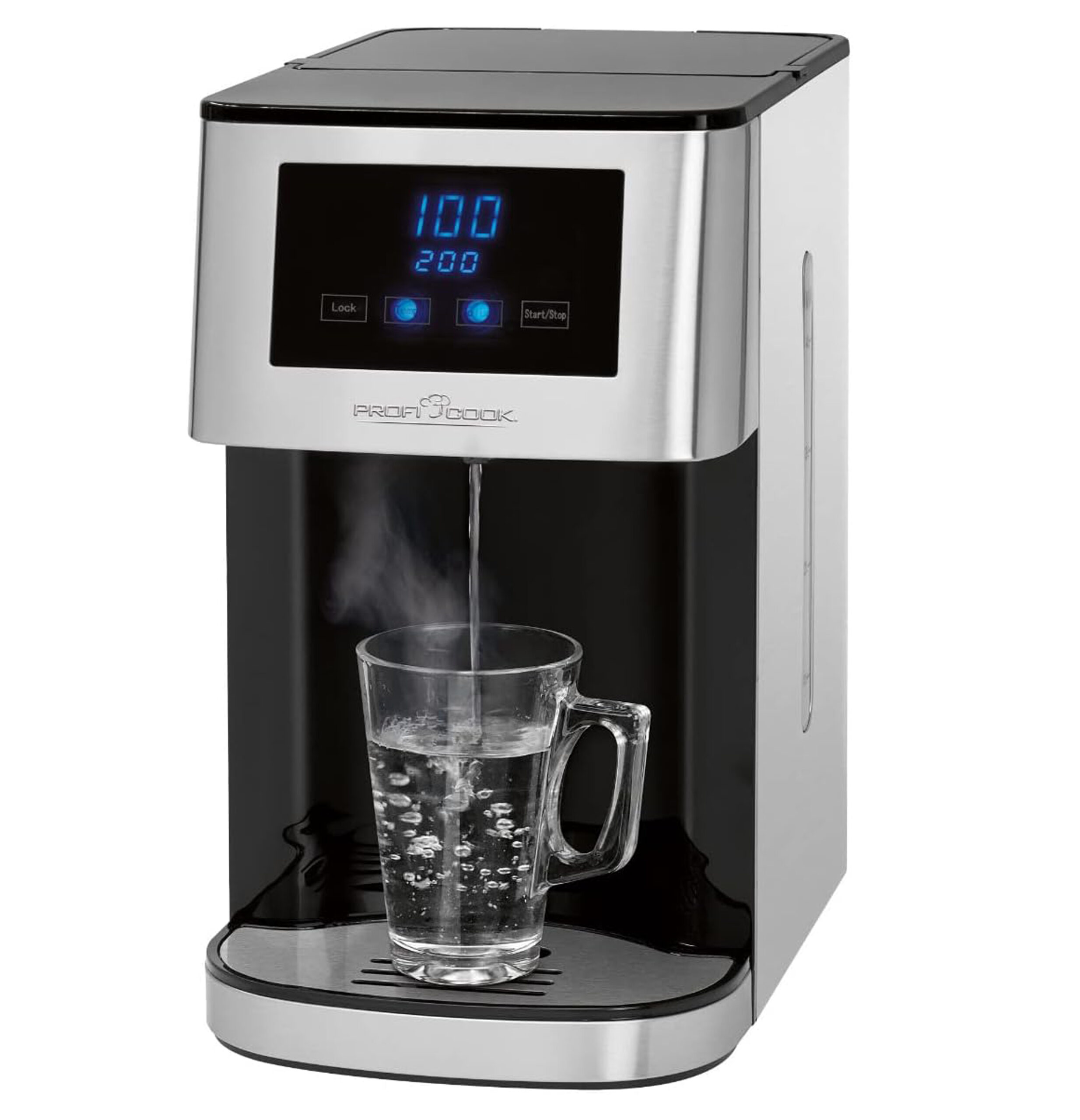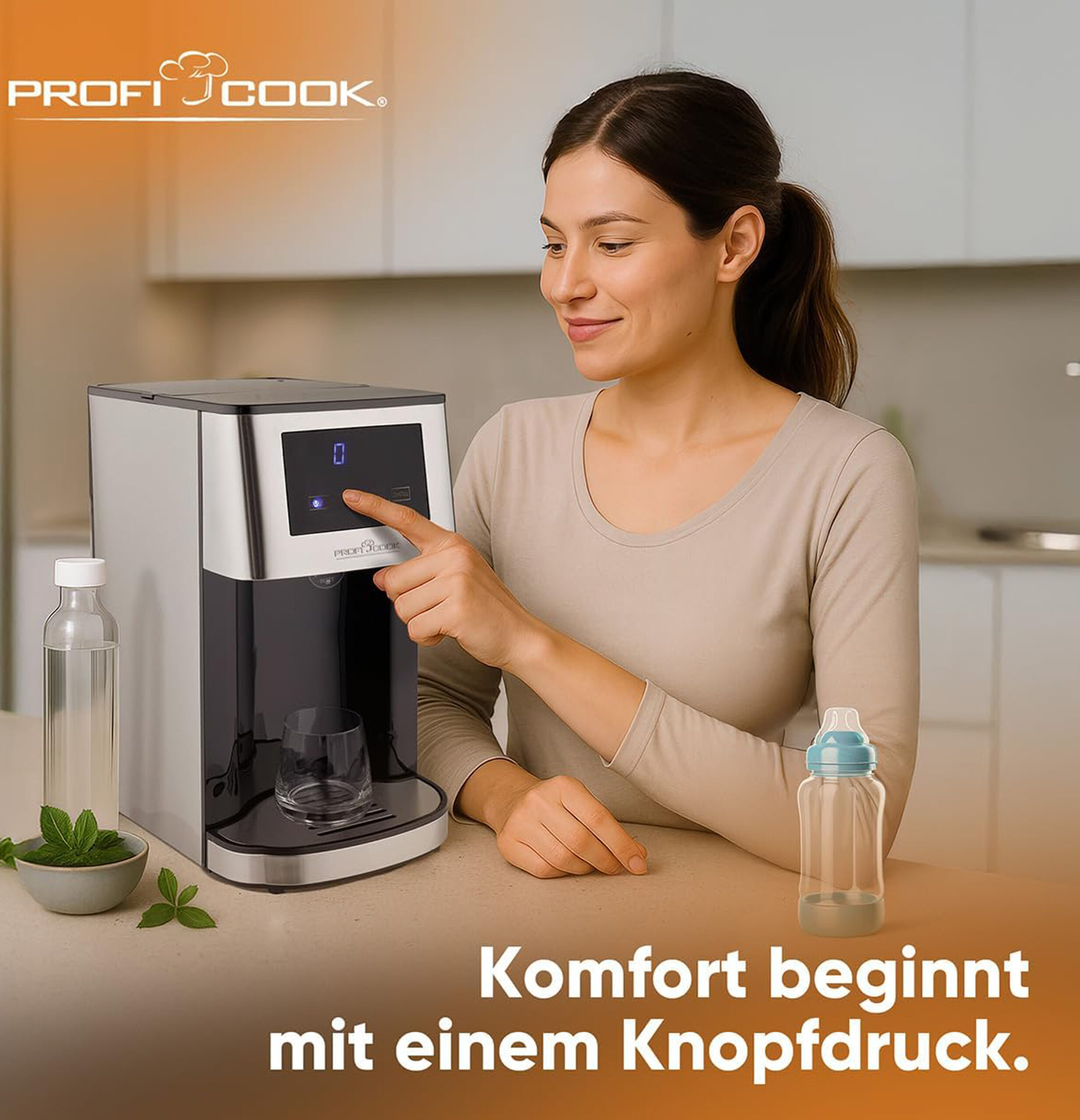 - DESIGN — The combination of stainless steel and black is timeless and fits perfectly into any kitchen. The modern, blue illuminated LED display and the stainless steel housing are further highlights of the ProfiCook hot water dispenser.