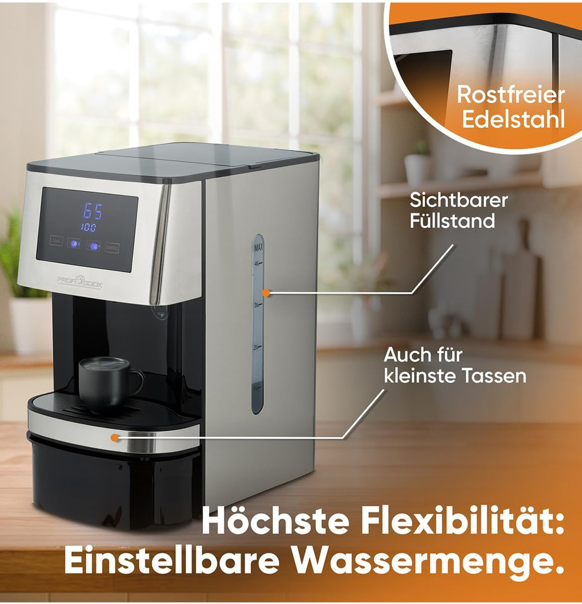 - FUNCTIONAL & CONVENIENT — ProfiCook gives you the option to individually set the desired amount of water to be dispensed (100ml, 200ml, 300ml, 400ml, 500ml continuously). The delivery includes a practical insert that you can use when using lower cups.