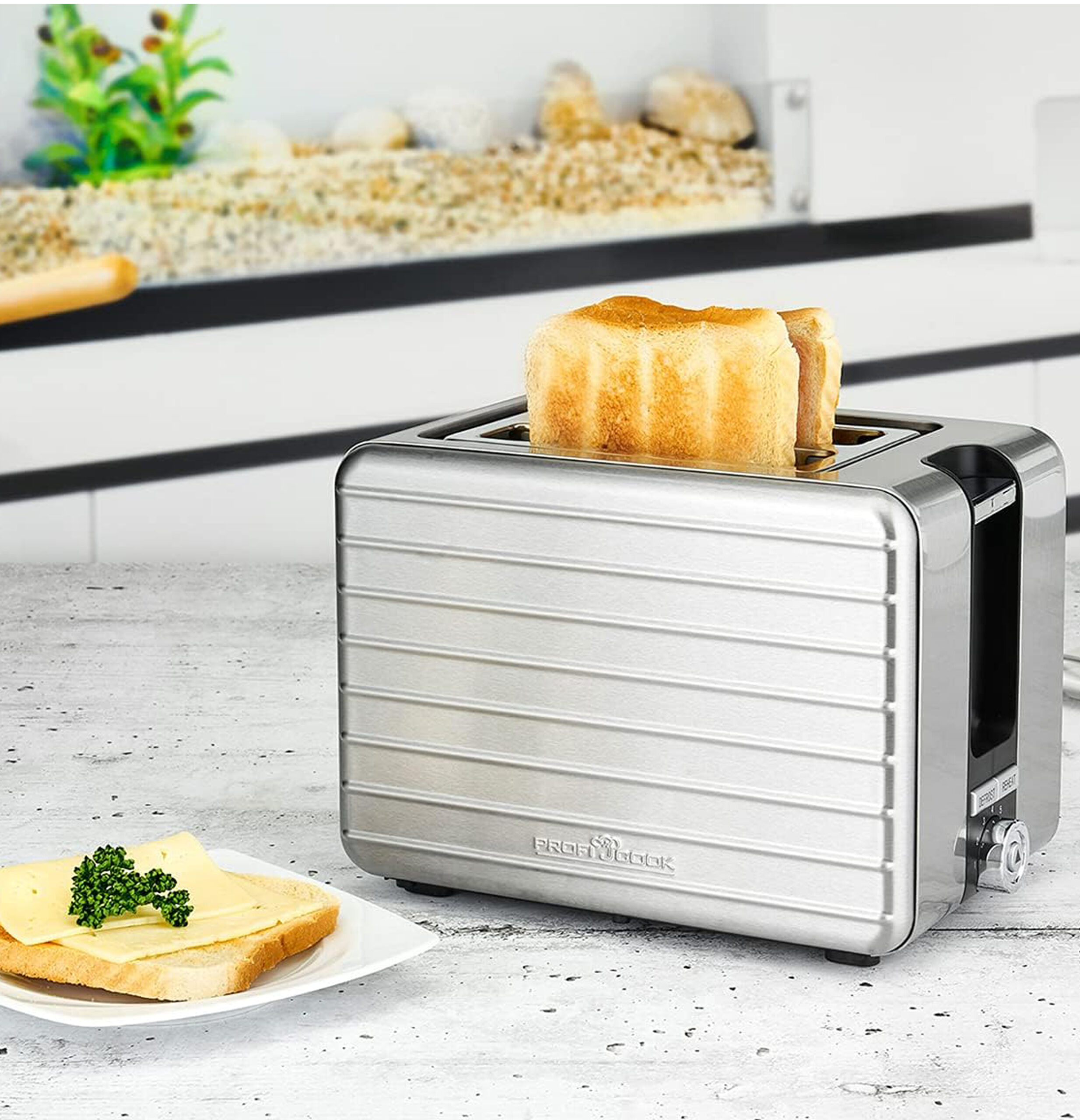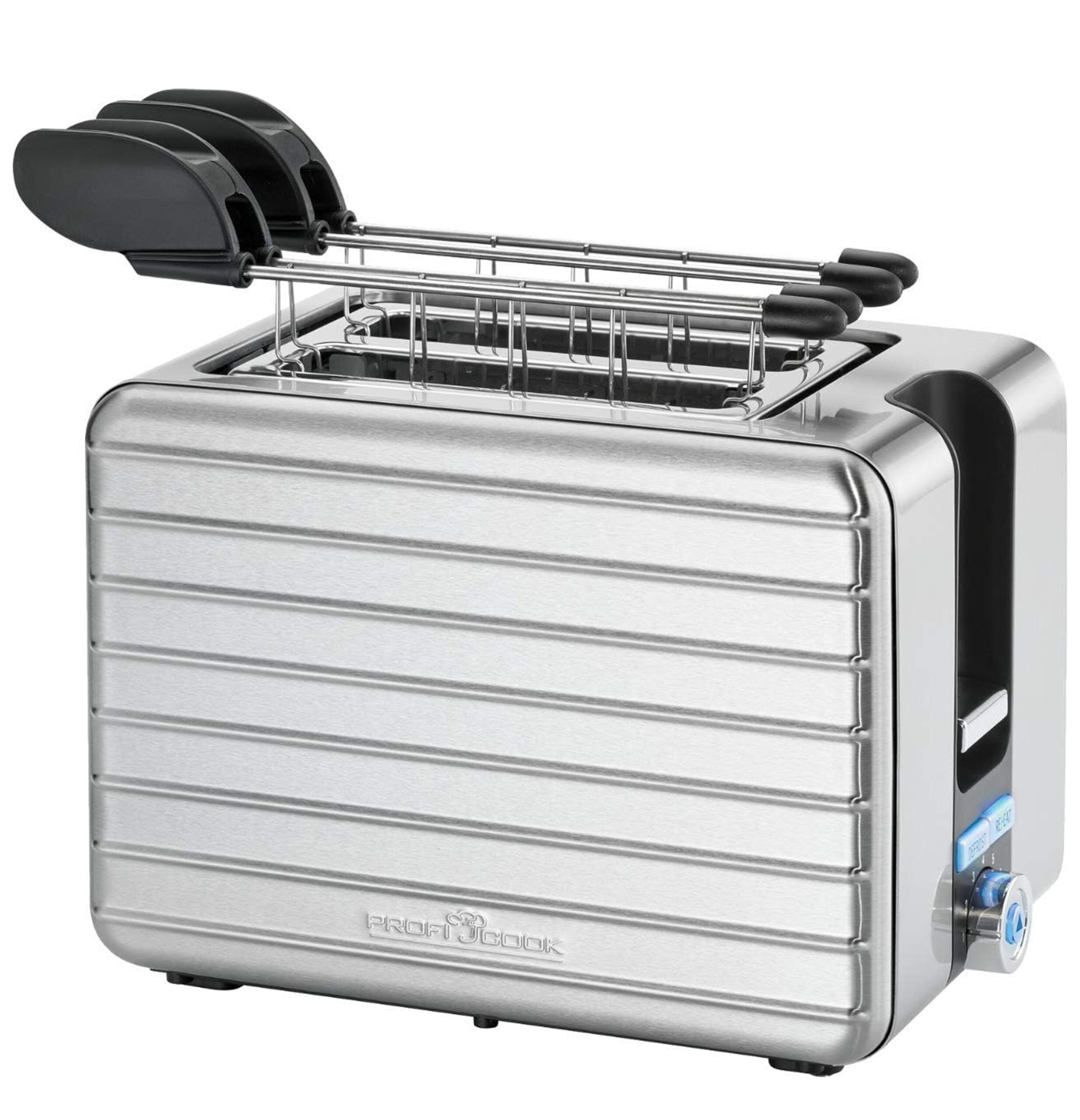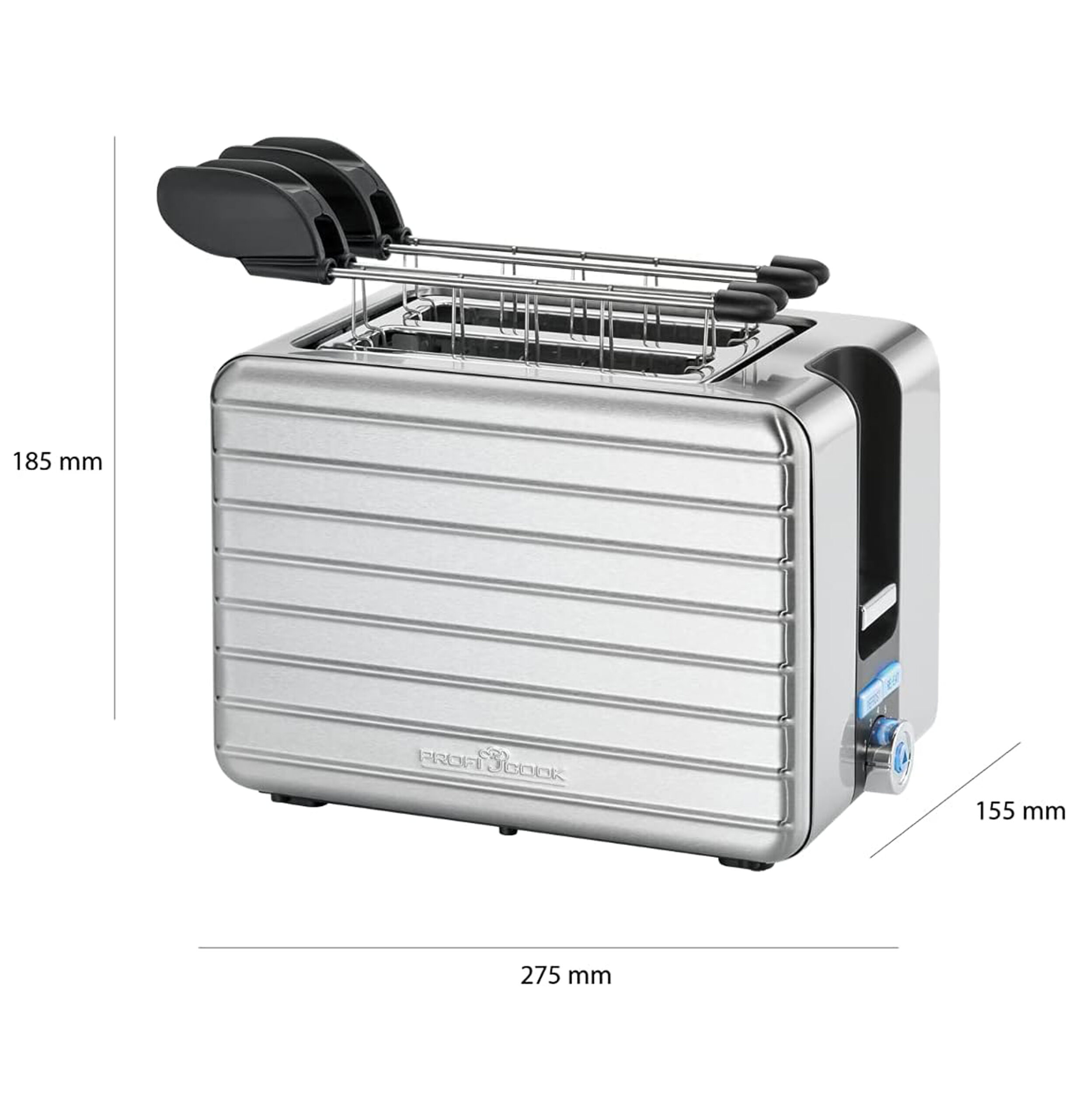 About this item PERFECT TOAST — The compact and high-quality toaster will conjure up the perfect toast with minimal space. The even heat distribution and the centring function allow for a constant browning, which you can adjust at the same time using the infinitely variable controller. The PC-TAZ 1110 impresses with its high-quality design with stainless steel housing and top performance. EXTRA + — The device can also be used as a conventional toaster. Thanks to the extra wide slot of toast up to 40 mm, you can also toast extra thick slices of bread. INCLUDED – Thanks to the included 2 stainless steel tongs with “cool touch” handle, the toast slices can be easily removed. In addition, you can easily prepare sandwiches