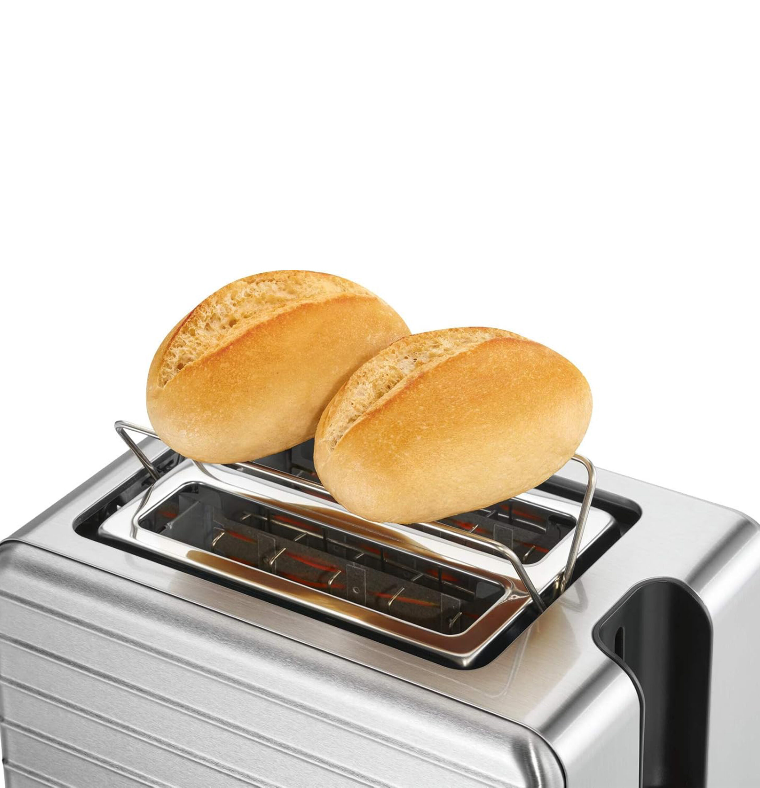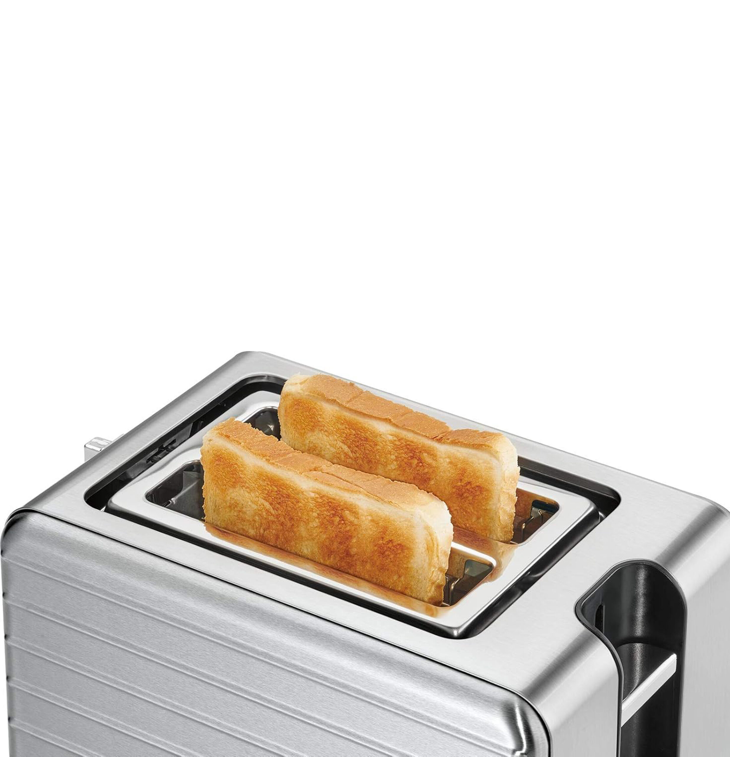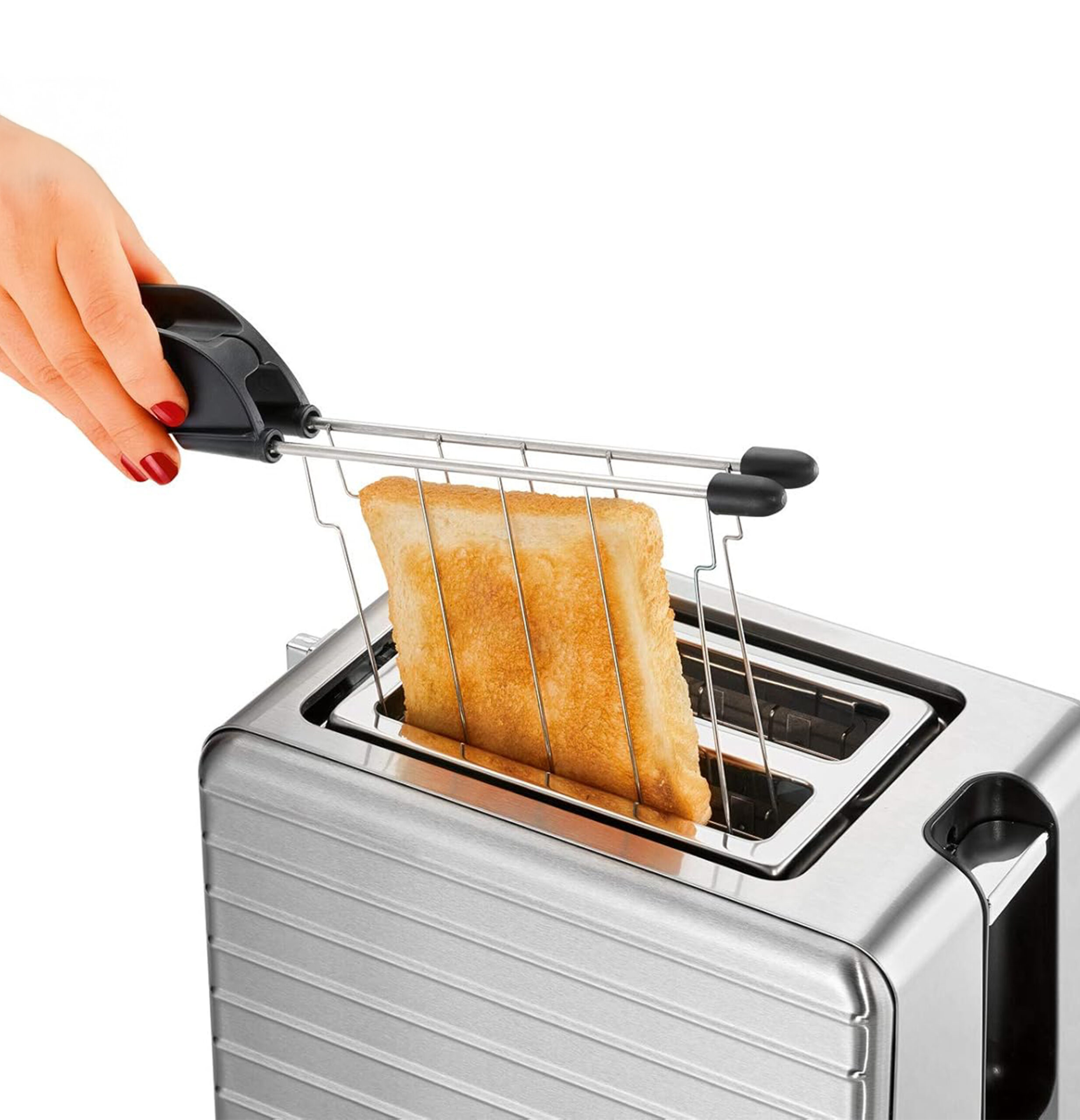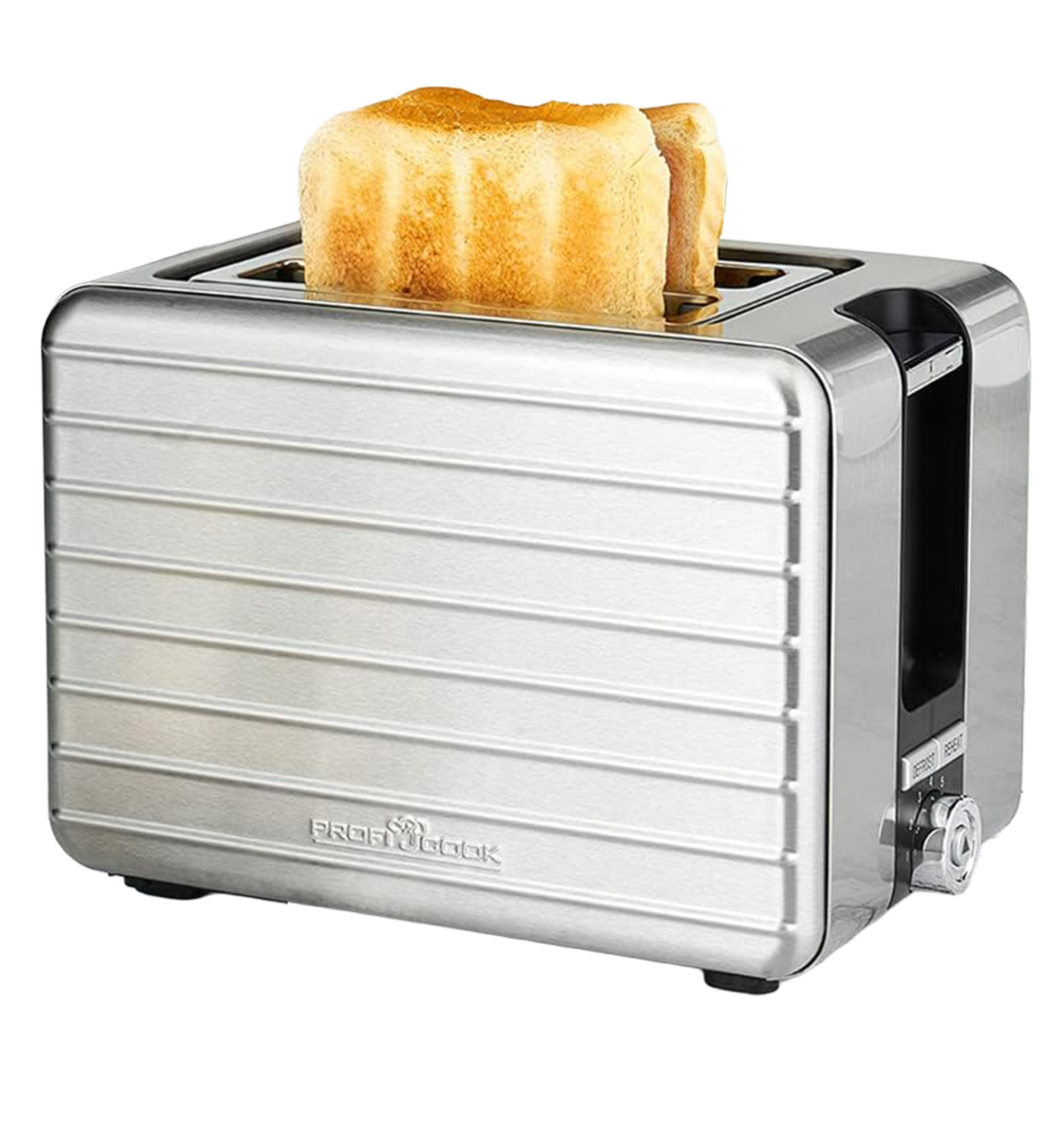 About this item PERFECT TOAST — The compact and high-quality toaster will conjure up the perfect toast with minimal space. The even heat distribution and the centring function allow for a constant browning, which you can adjust at the same time using the infinitely variable controller. The PC-TAZ 1110 impresses with its high-quality design with stainless steel housing and top performance. EXTRA + — The device can also be used as a conventional toaster. Thanks to the extra wide slot of toast up to 40 mm, you can also toast extra thick slices of bread. INCLUDED – Thanks to the included 2 stainless steel tongs with “cool touch” handle, the toast slices can be easily removed. In addition, you can easily prepare sandwiches