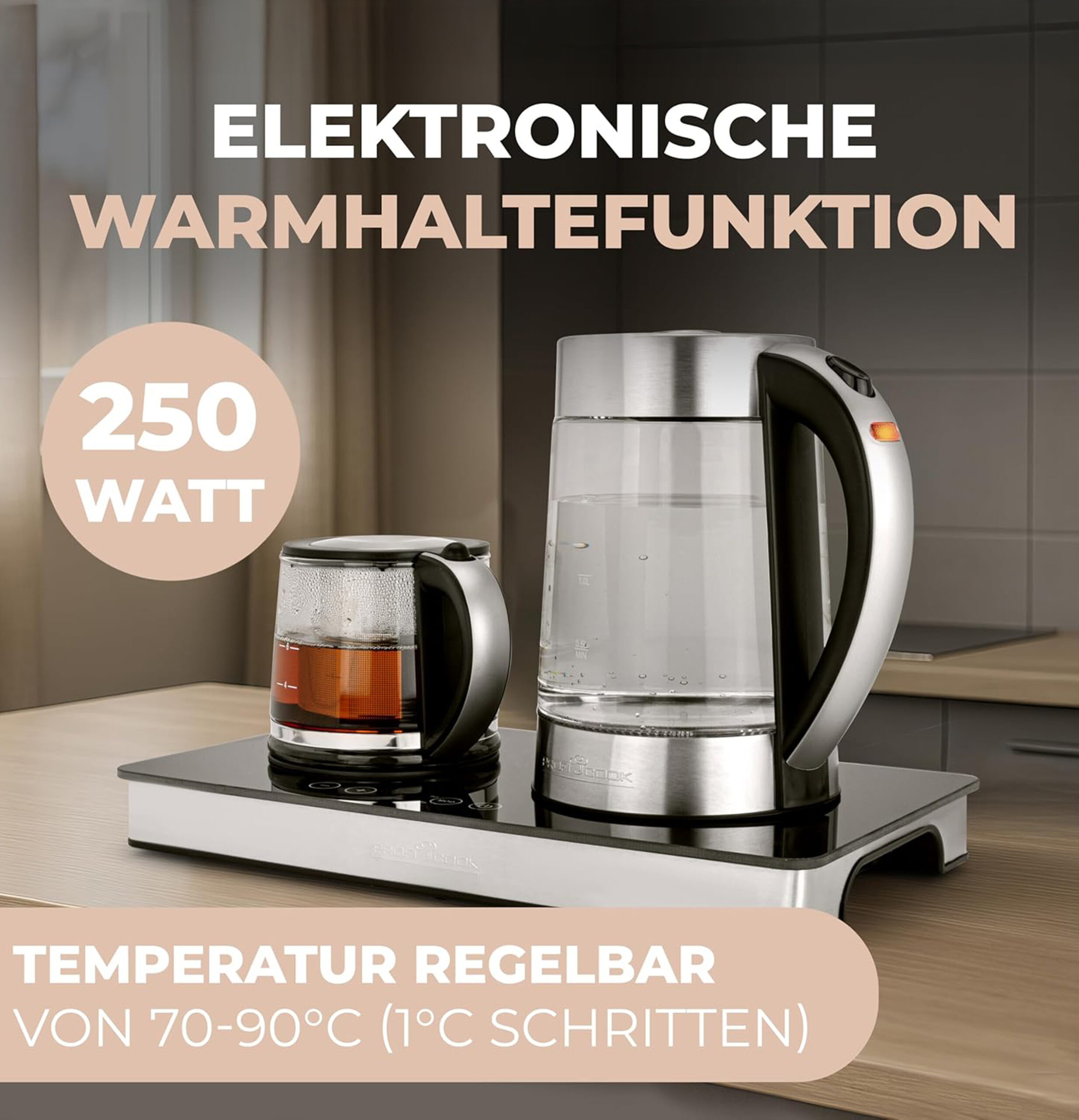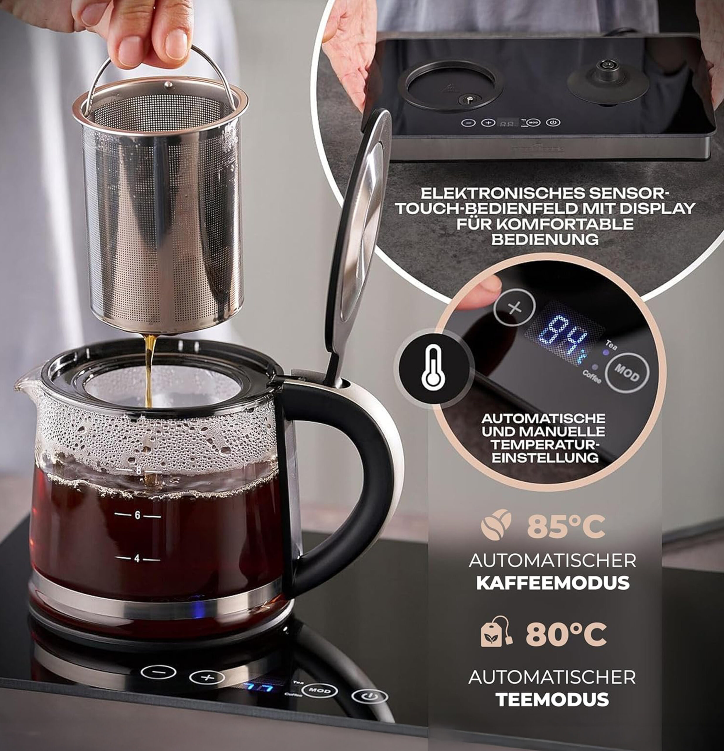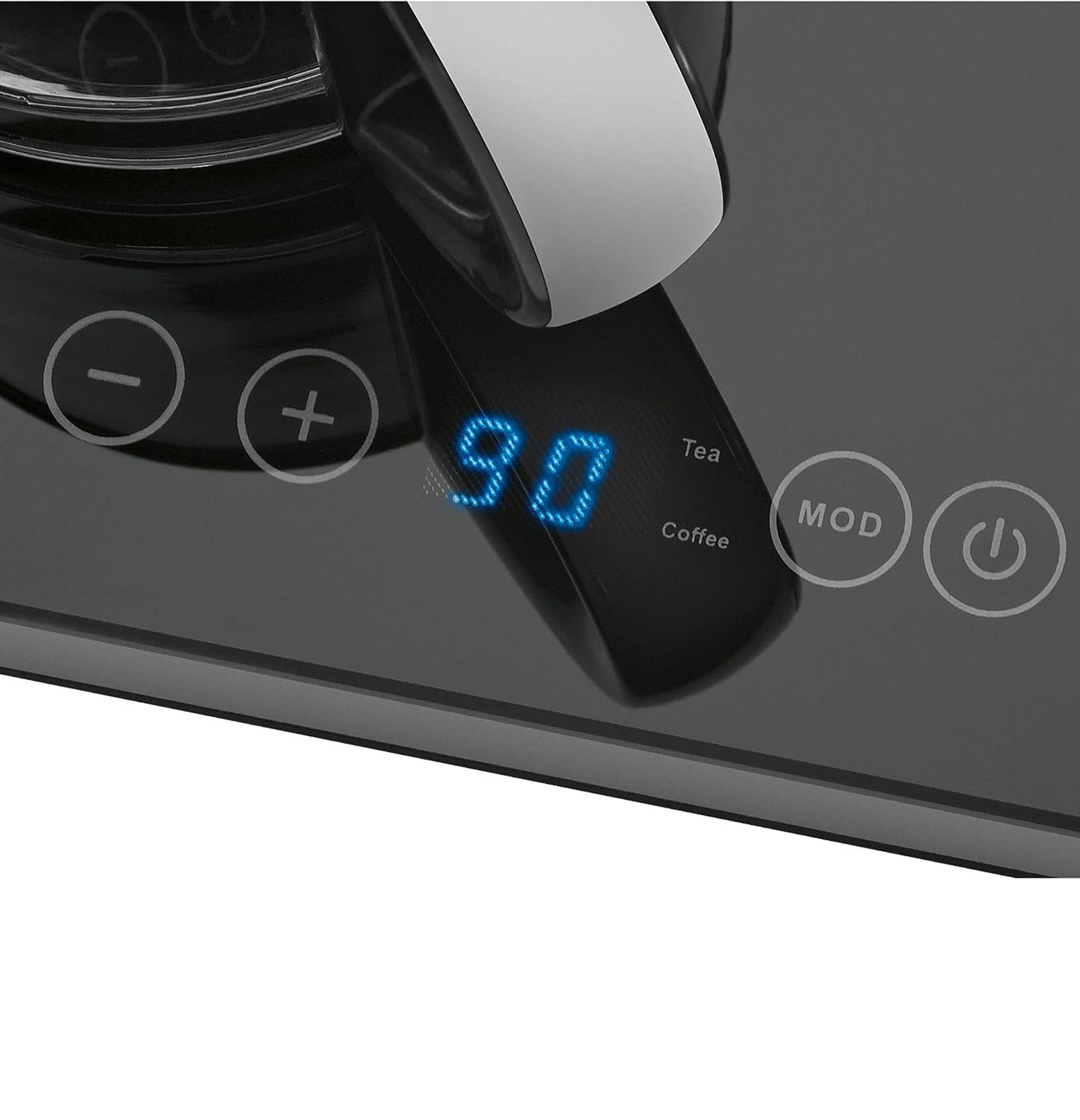 - Electronic keep warm function with Heating plate (non-stick coated) & automatic and manual temperature setting (automatic setting: Coffee mode: 85 °C, automatic setting tea mode: 80 °C, manual setting adjustable in steps of 1 °C from 70 to 90 °C)